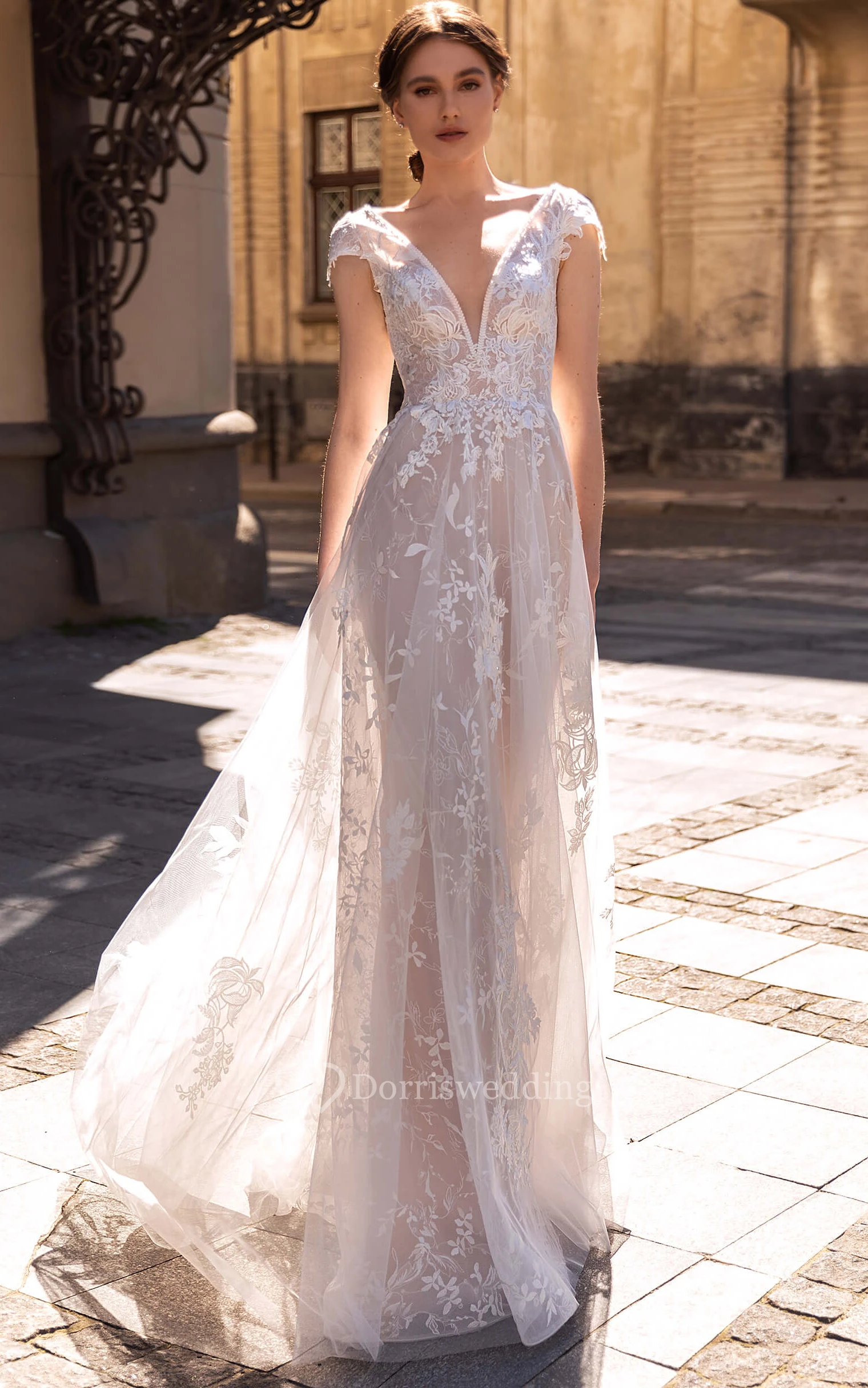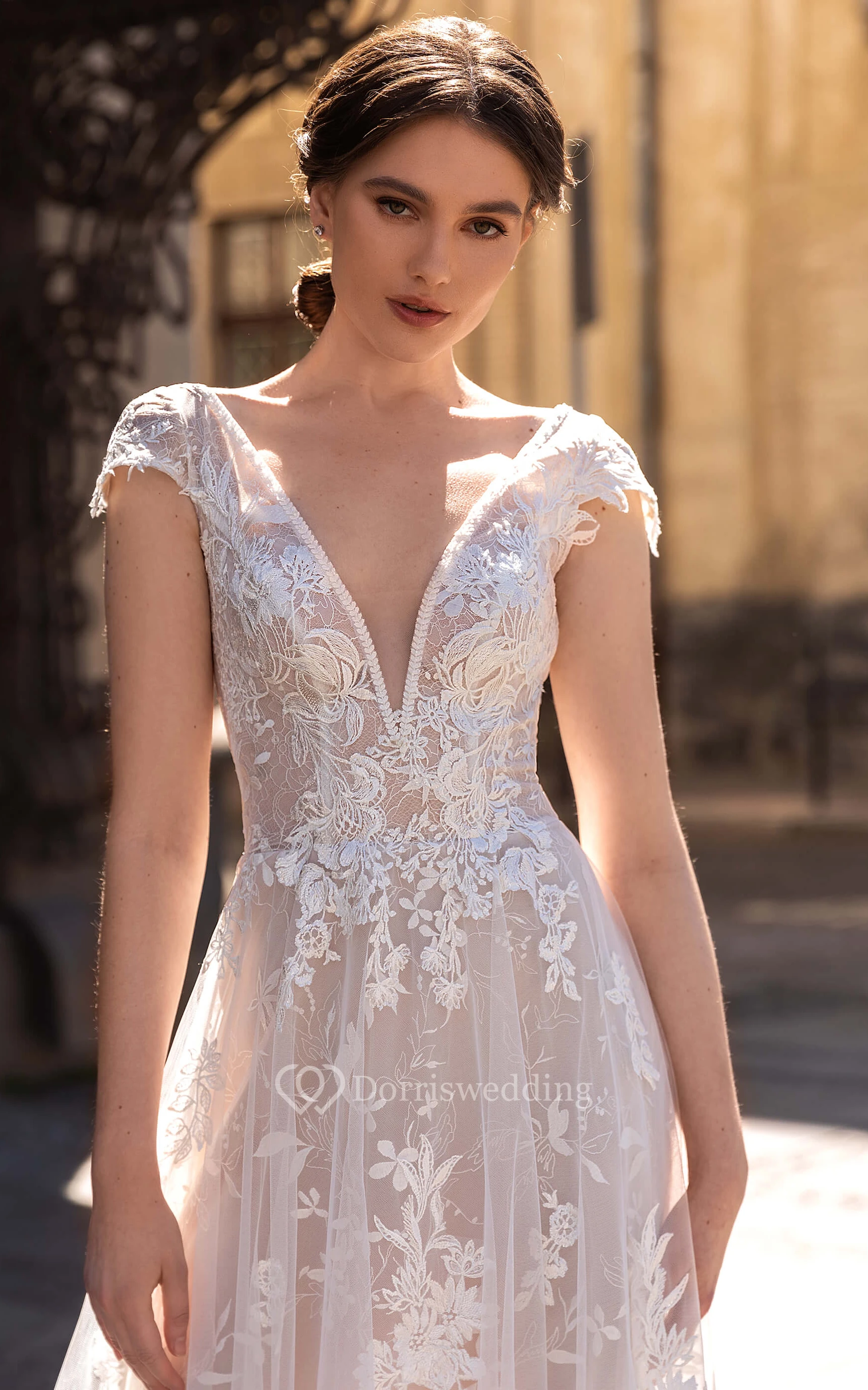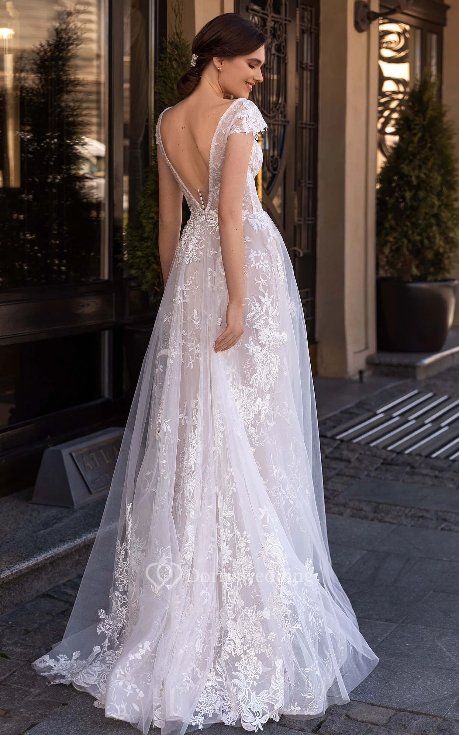 Elegant A Line Lace Floor-length Floor-length Backless Wedding Dress with Appliques