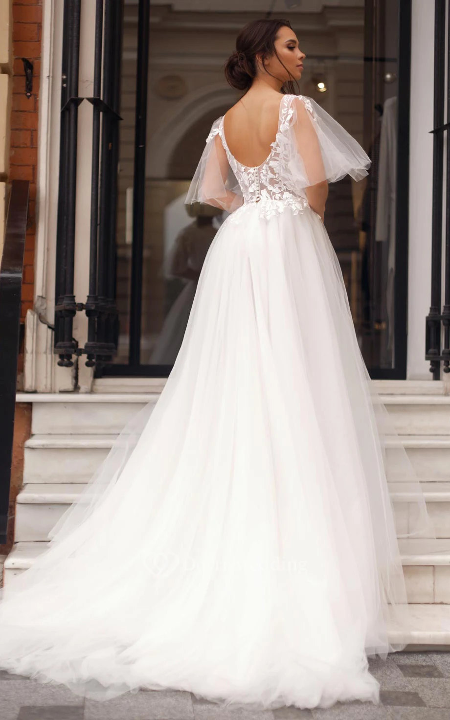 Elegant Bateau A Line Tulle and Lace Sweep Train Wedding Dress with Appliques
