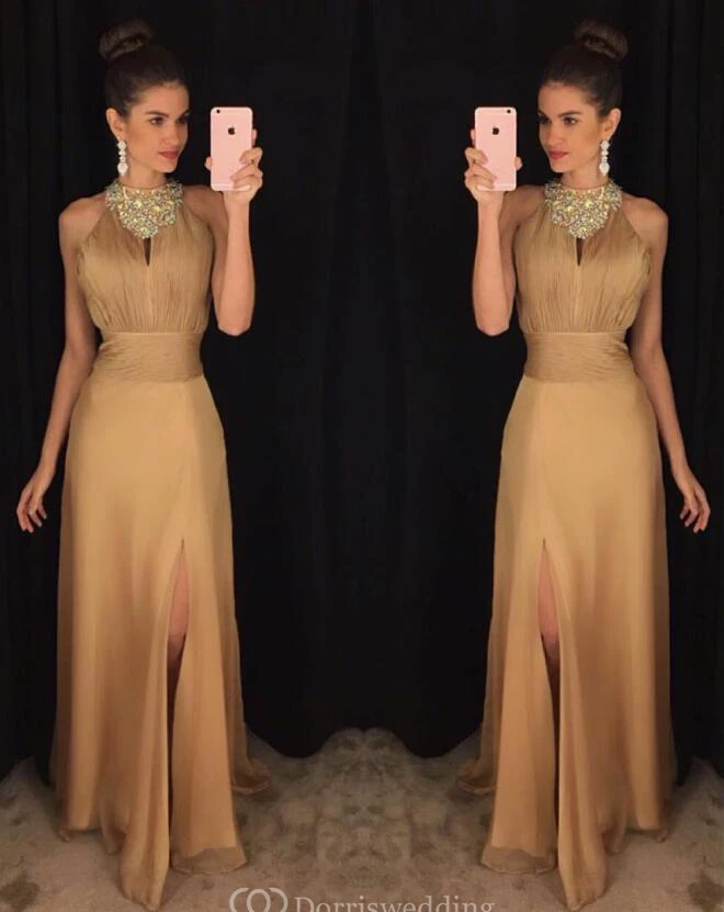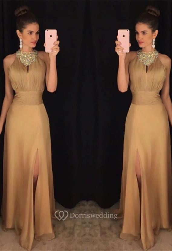 Elegant Beadings Front Split Prom Dress A-line Halter Sleeveless