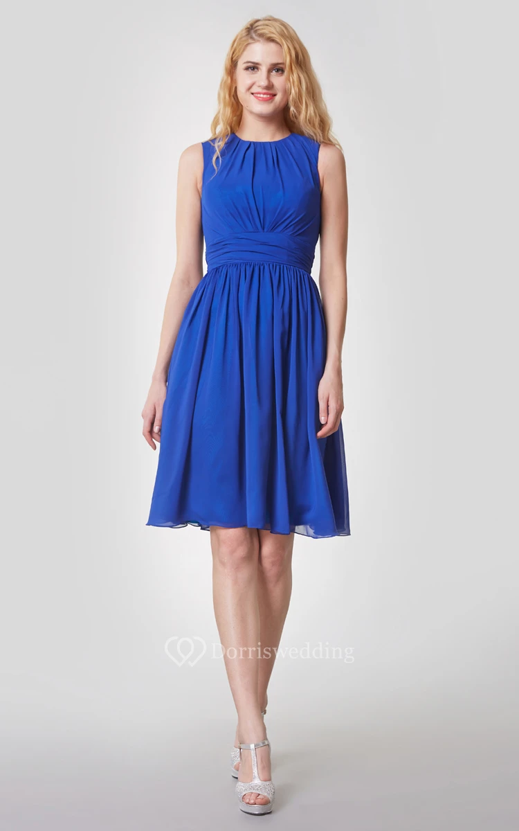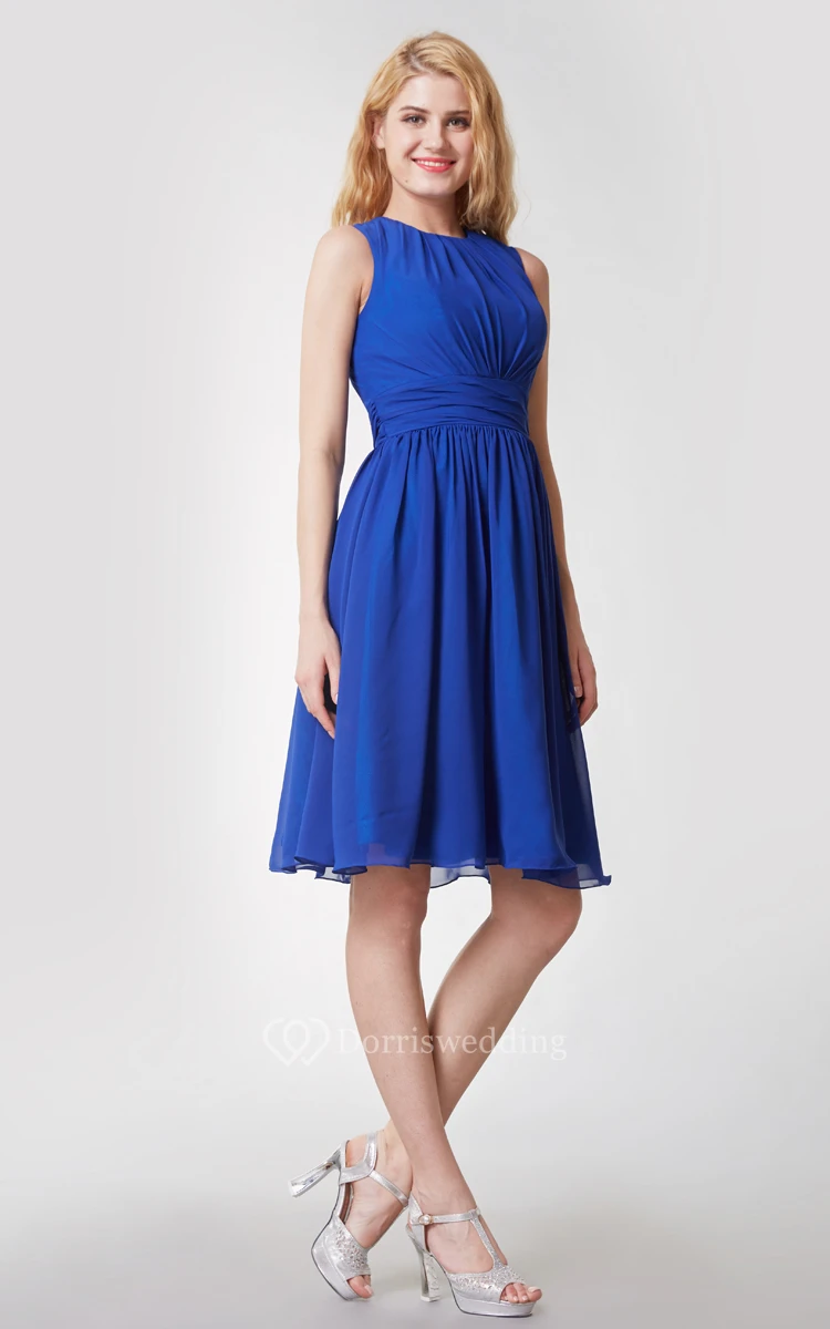 Elegant High Neck Pleated Short Chiffon Dress With Sash