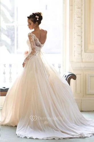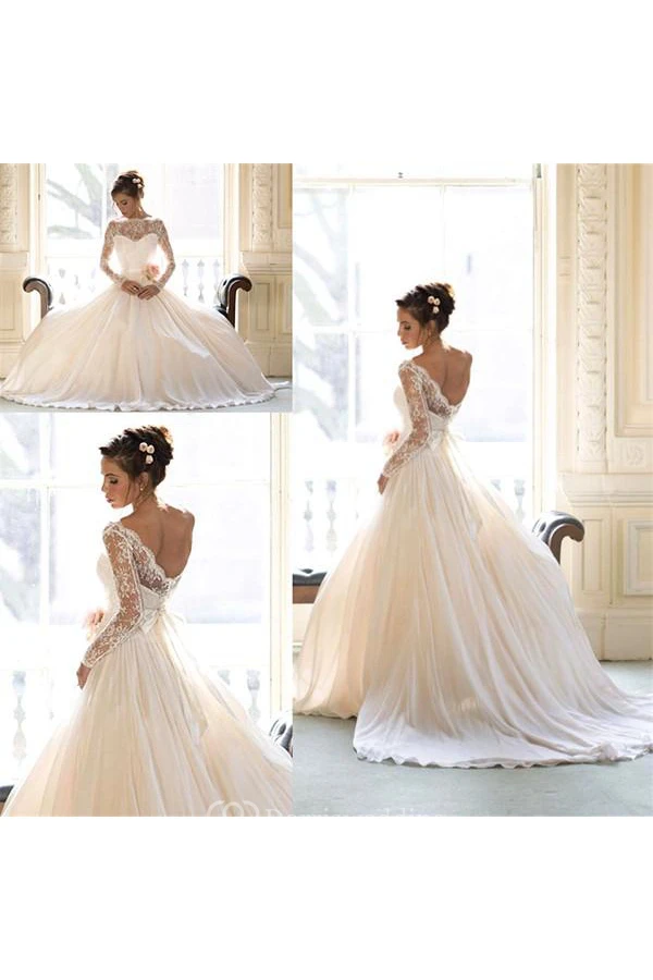 Elegant Lace A-line Bowknot Wedding Dress Court Train Long Sleeve
