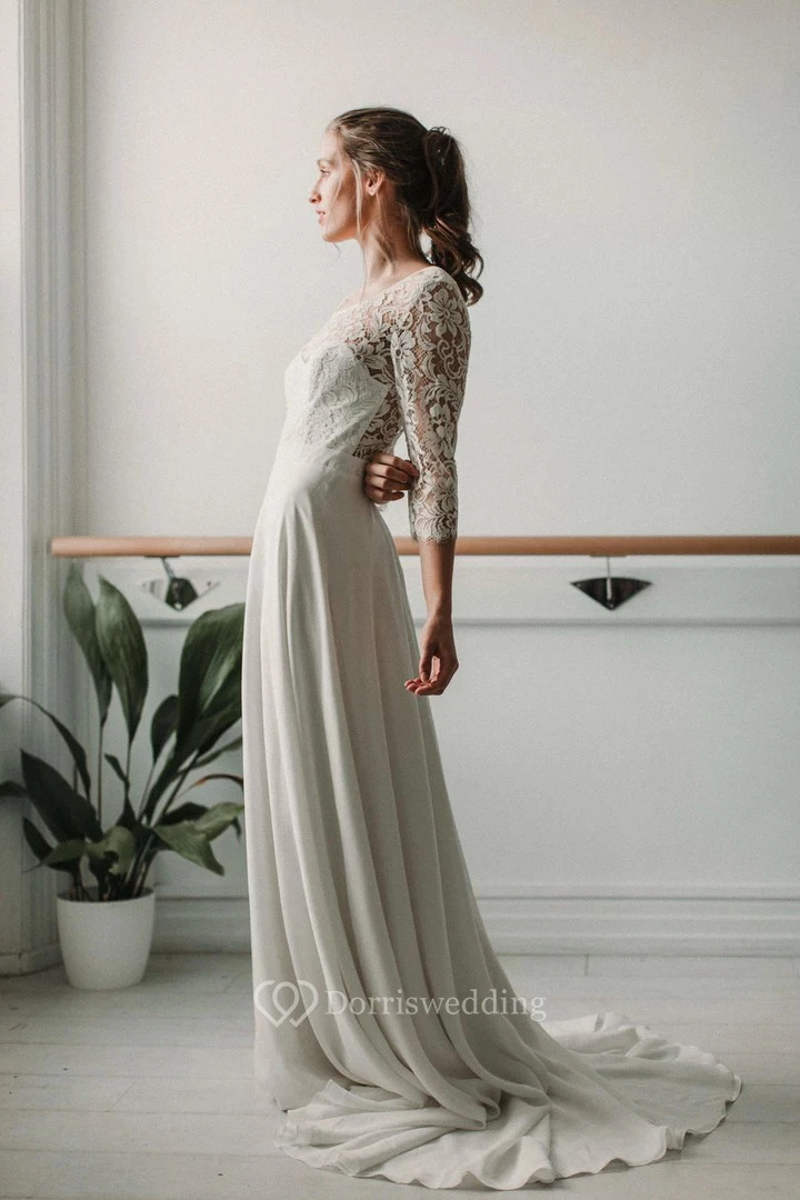 Elegant Lace and Chiffon Sheath 3/4 Sleeve Deep-V Back Bridal Gown