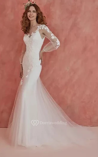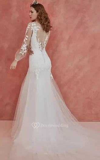 Elegant Lace Bateau Long Sleeve Appliques Wedding Dress With Button