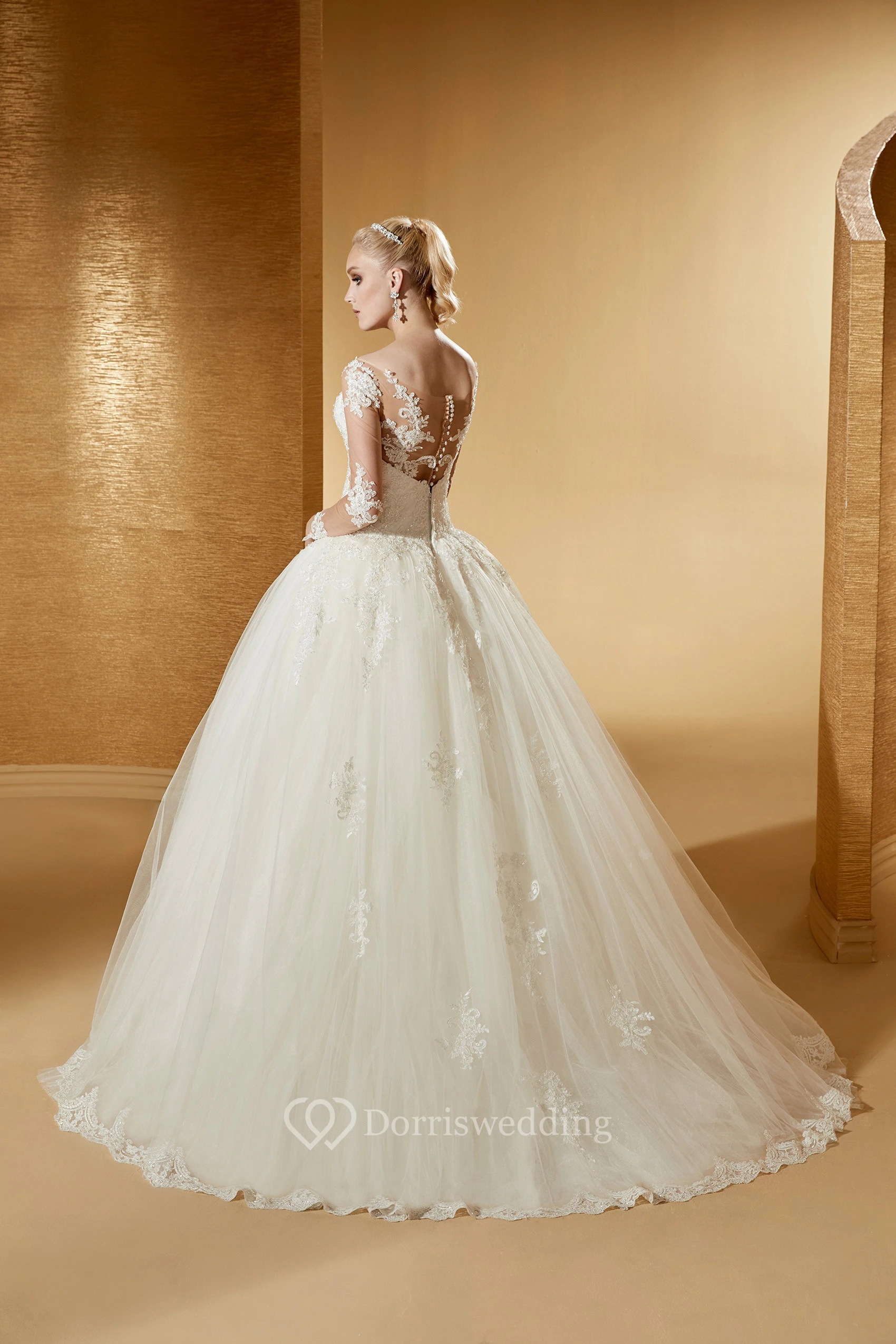 Elegant Long-Sleeve Ball Gown With Illusive Design And Lace Bodice