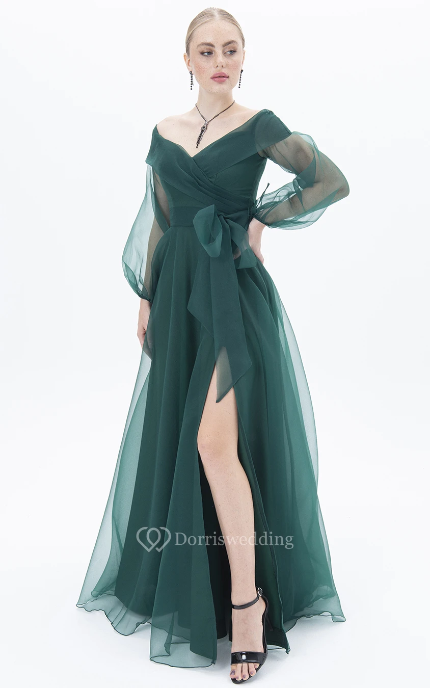 Elegant Long Sleeve Floor-length A Line Chiffon Zipper Formal Dress with Split Front