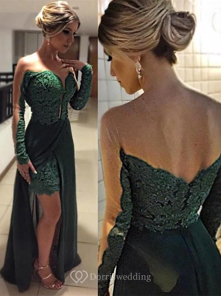 Elegant Long Sleeve Green Evening Dresses Skirt Long Lace Appliques