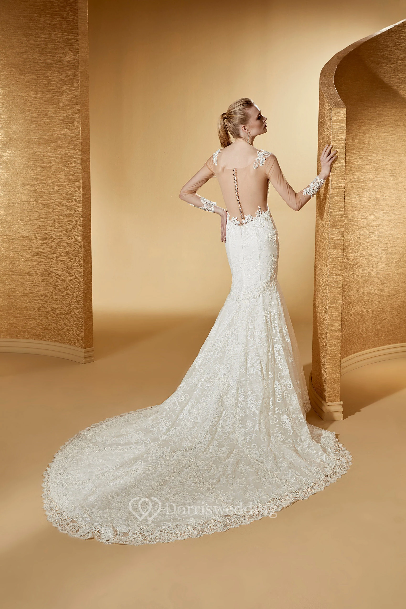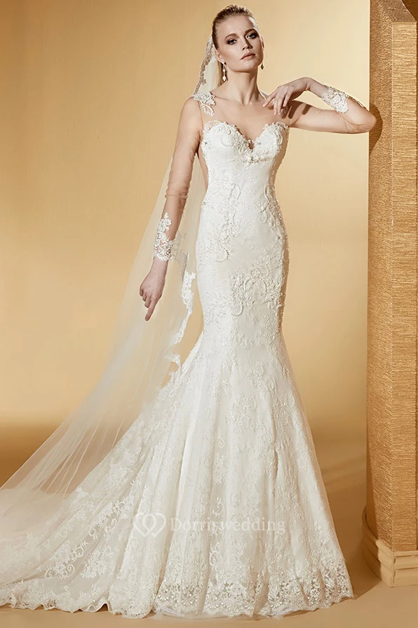 Elegant Long-Sleeve Mermaid Lace Gown With Illusive Design And Court Train