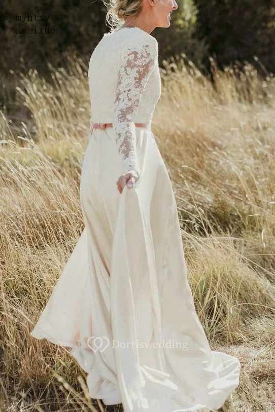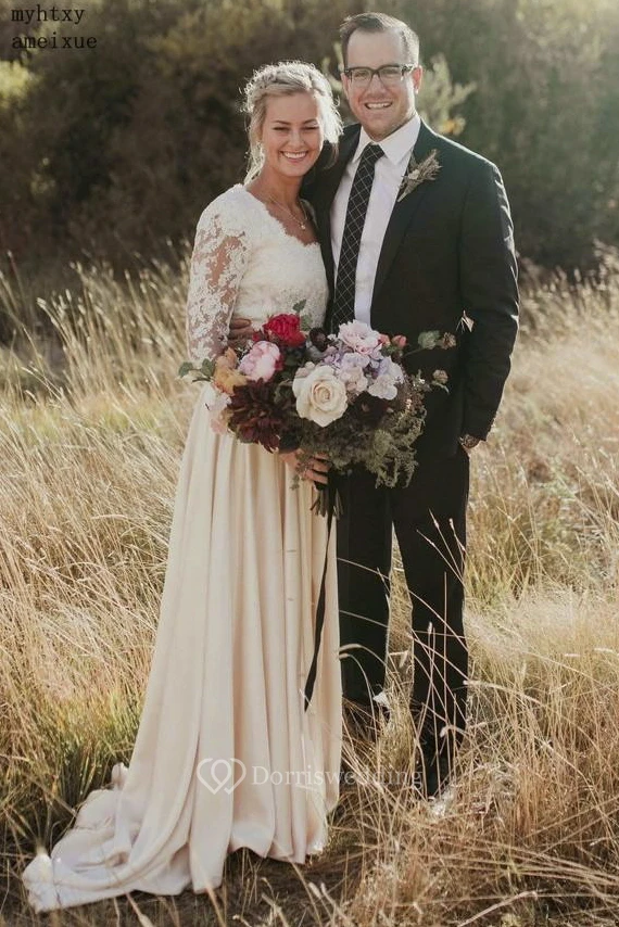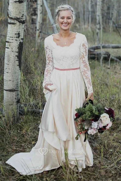 Elegant Long Sleeve Sheath Scalloped Lace And Satin Wedding Bridal Gown