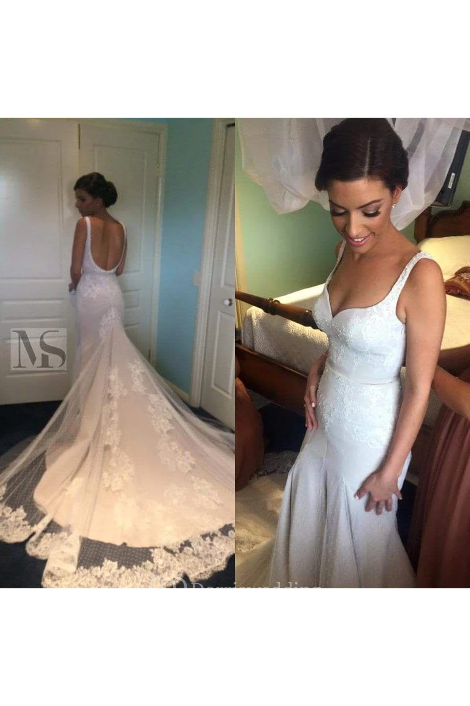 Elegant Mermaid Lace Appliques Wedding Dress Open Back Long Train