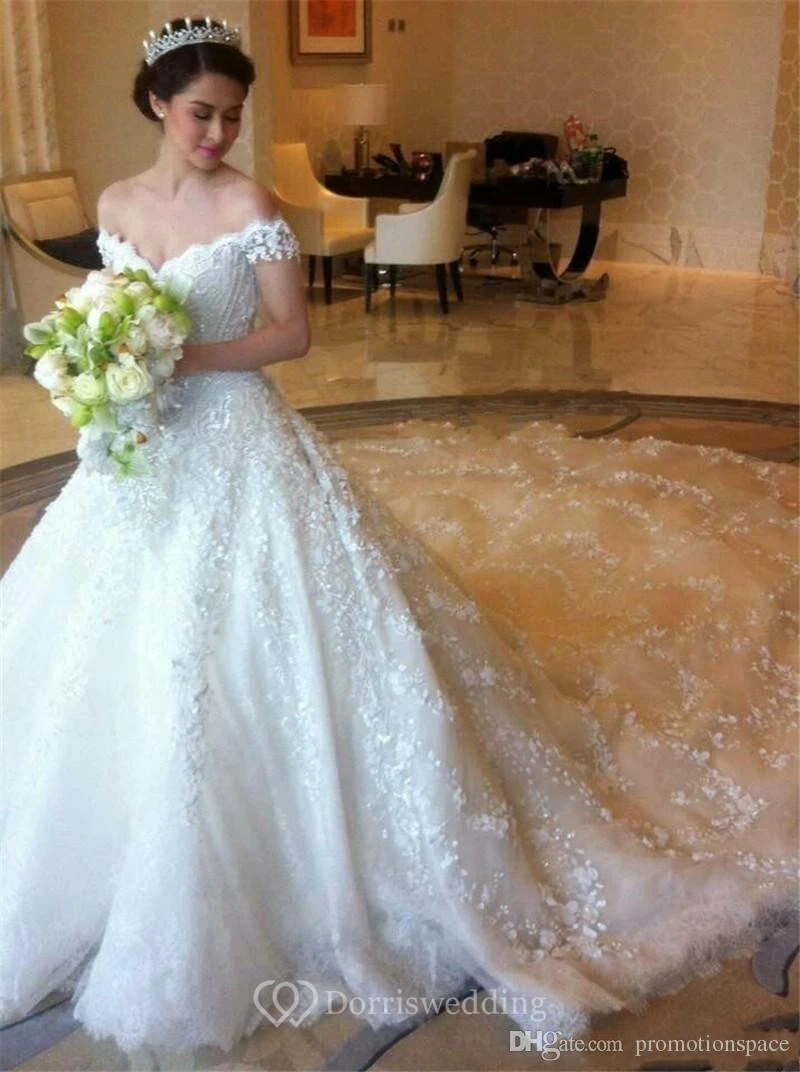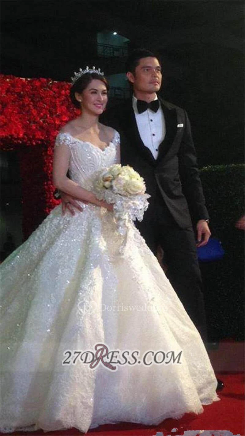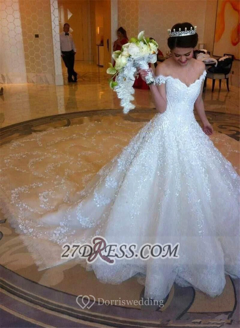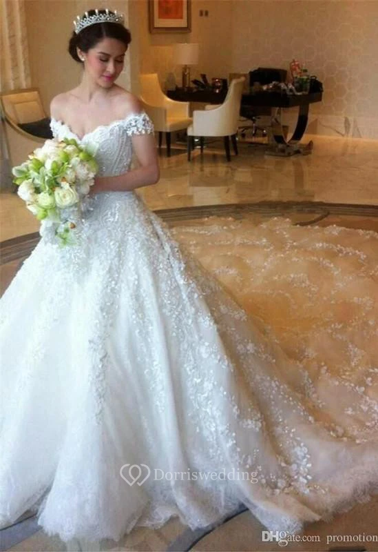 Elegant Off-shoulder Tulle Wedding Dress Ball Gown With Lace Appliques