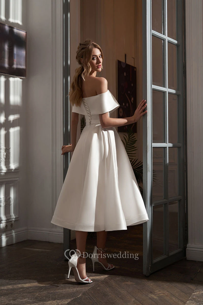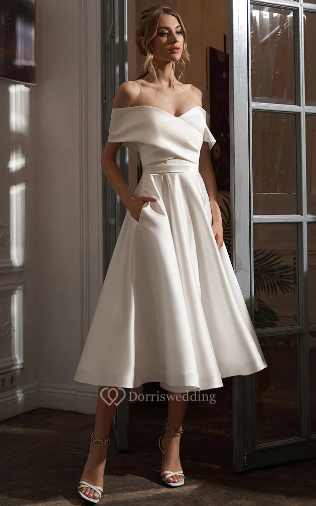 Elegant Off-the-shoulder Empire A-line Satin Tea-length Wedding Dress