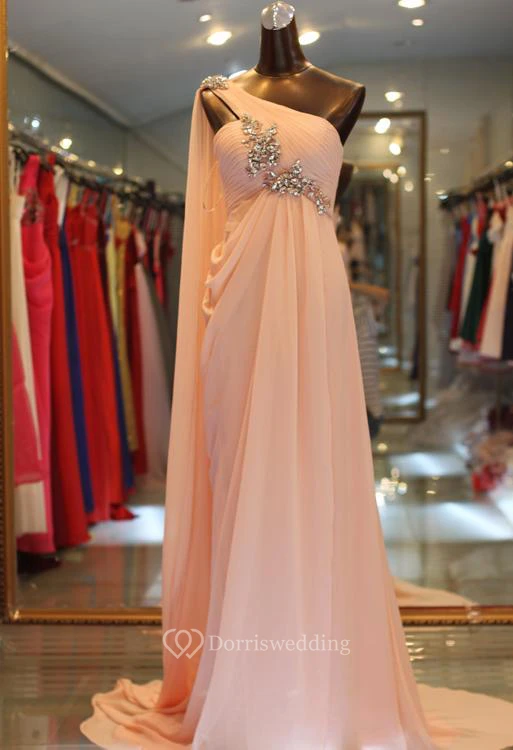 Elegant One Shoulder Long Chiffon Evening Dress With Crystals