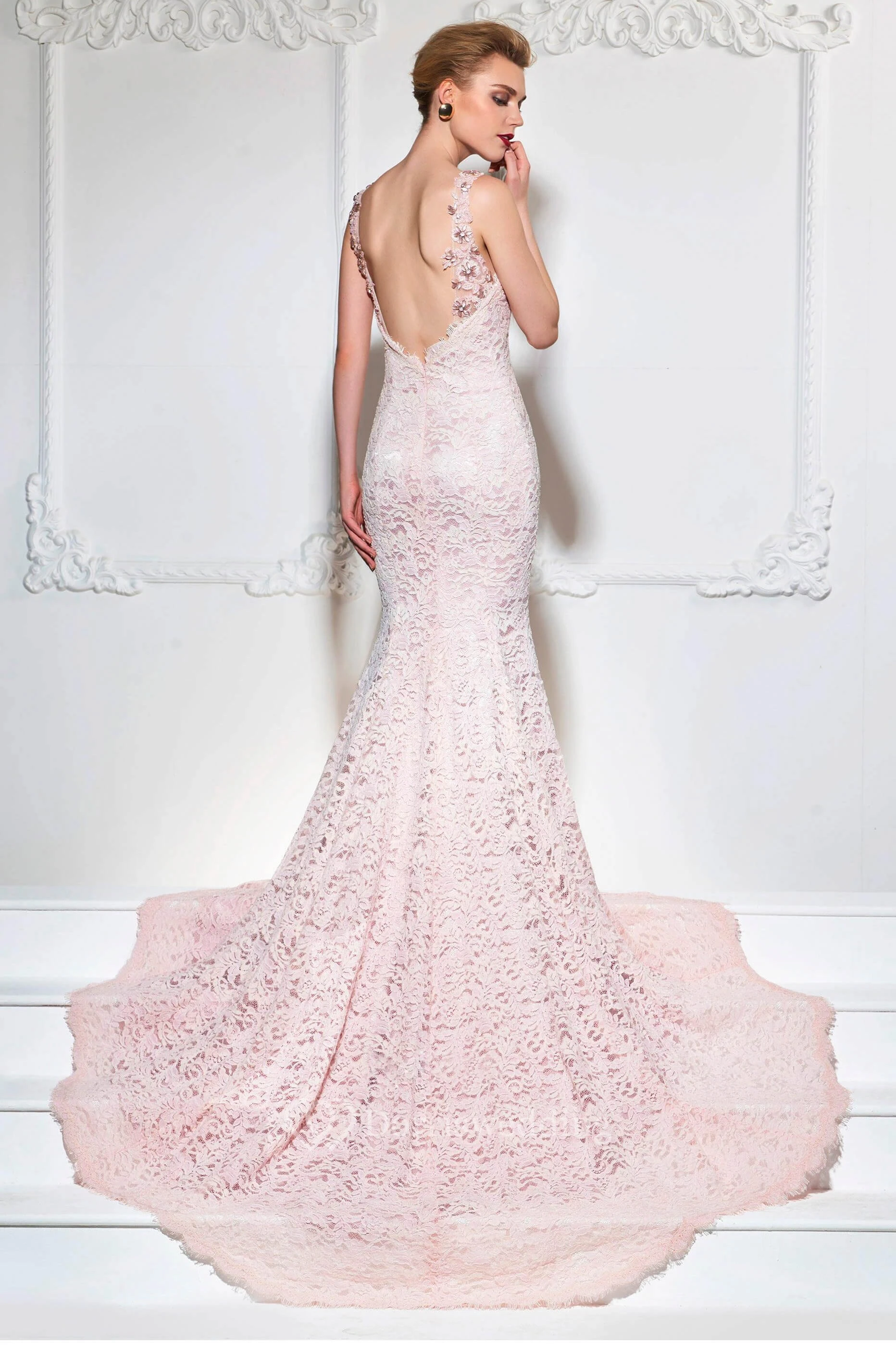 Elegant Open Back Lace Mermaid Gown With Floral Appliqued Straps