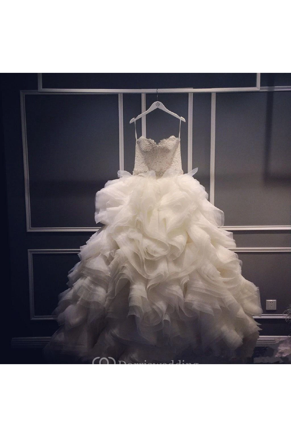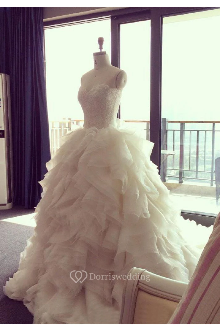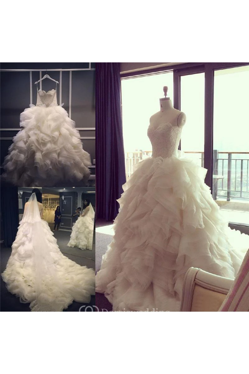 Elegant Ruffles Appliques Beadings Tulle Wedding Dress Spaghetti Strap
