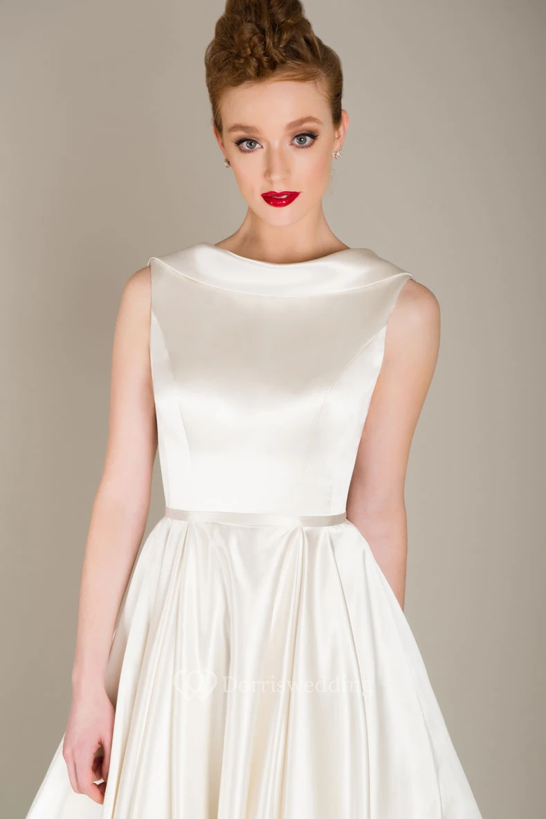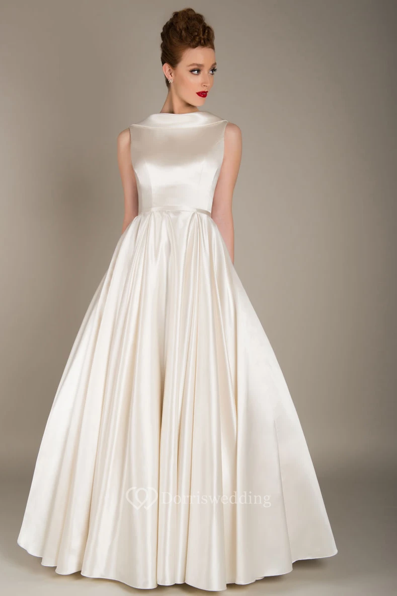 Elegant Satin Floor Length Jewel Neck Sleeveless Wedding Dress with Ruching