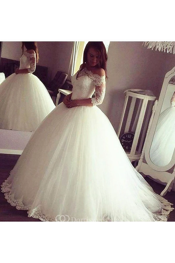 Elegant Sheer Long Sleeve Off the Shoulder Tulle Lace Appliqued Bridal Dresses Gown