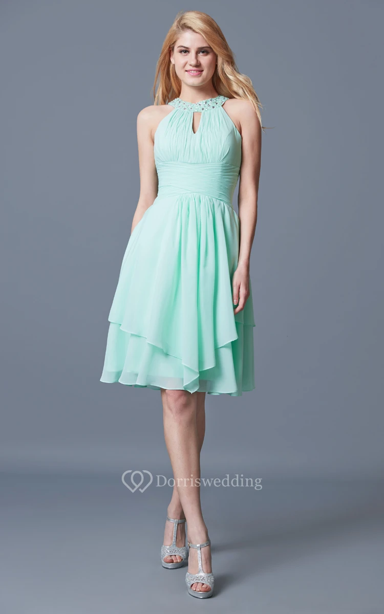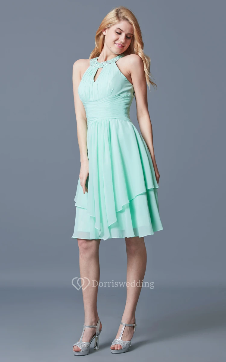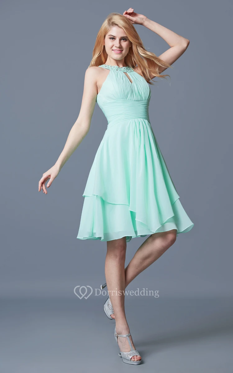 I ordered this short chiffon dress in aqua and it arrived to be just as imagined. The fabric is so good quality and the skirt flows nicely. I got lots of good comments about the dress. I am glad to have bought this dress.