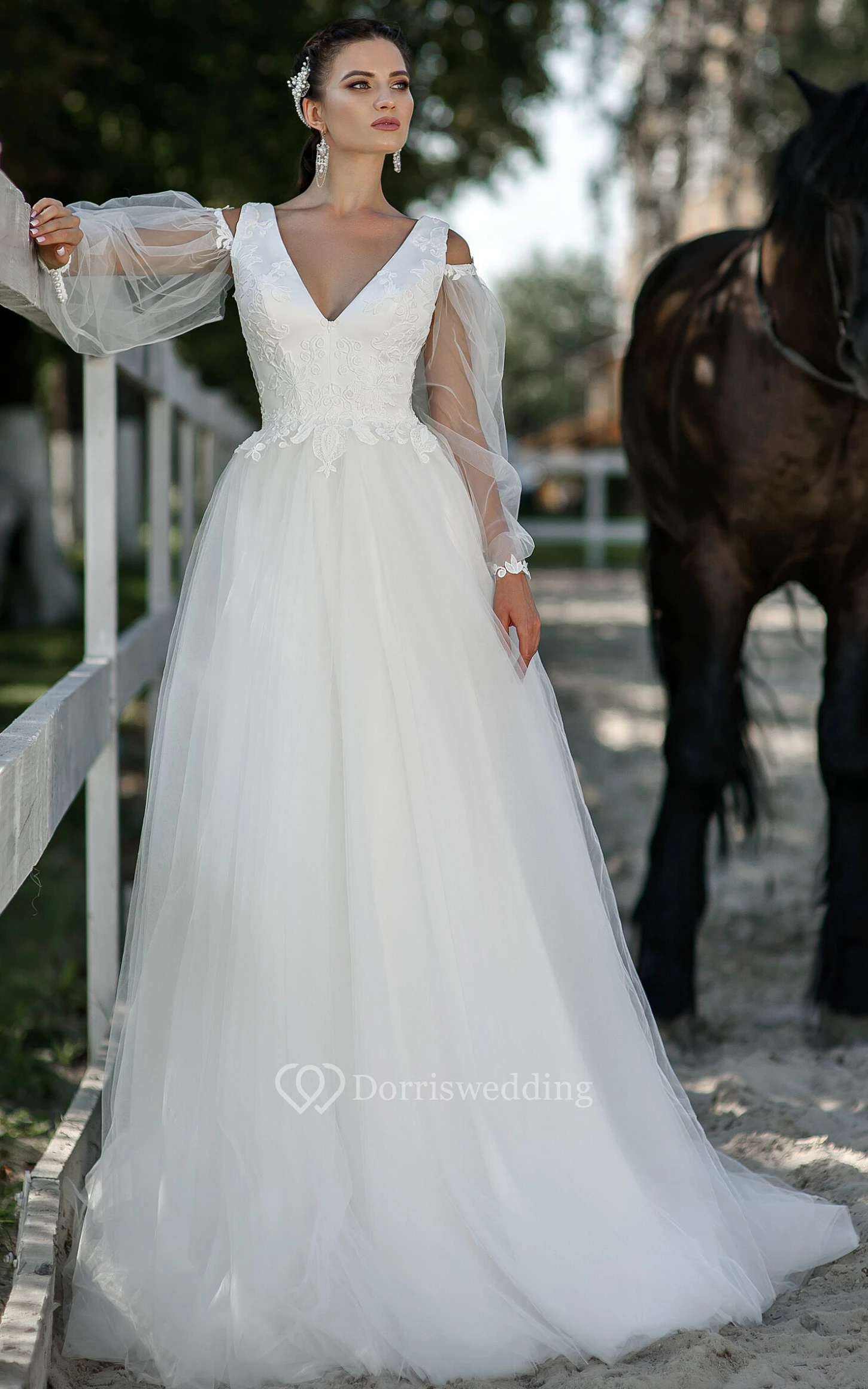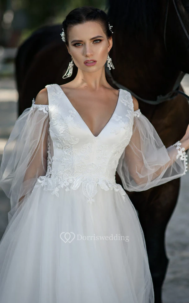 Elegant Tulle V-neck Long Sleeve Appliques Modest Wedding Dress With Button