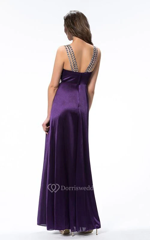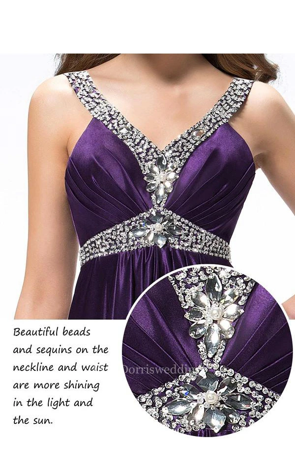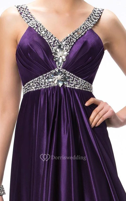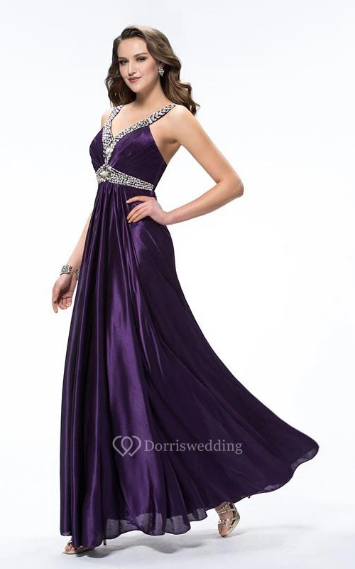 Elegant V-Neck Beading Ruched Straps Empire Floor-Length Evening Dress
