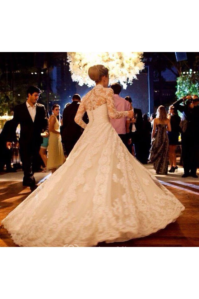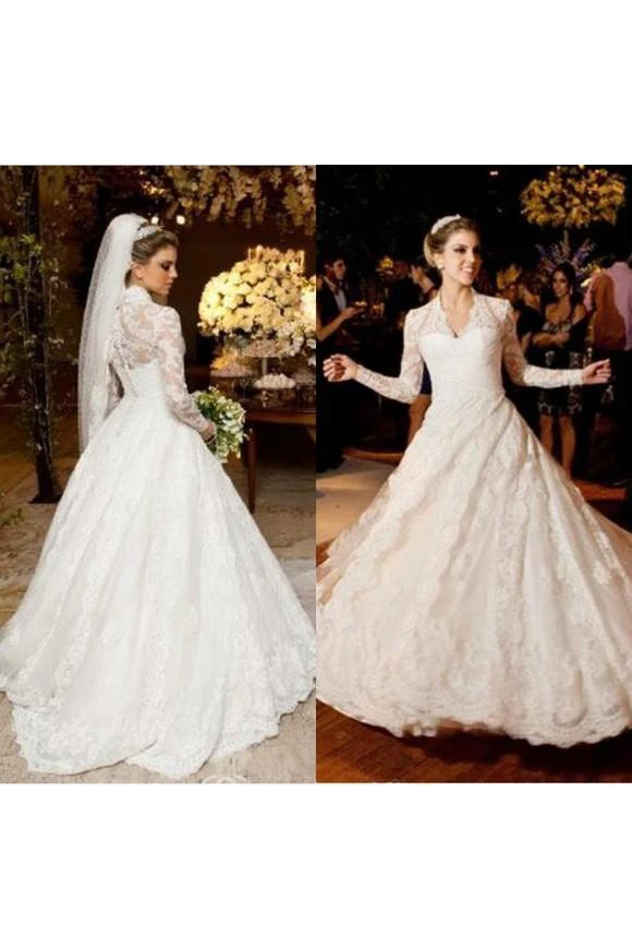 Elegant V-neck Long Sleeve Lace Wedding Dress Ball Gown