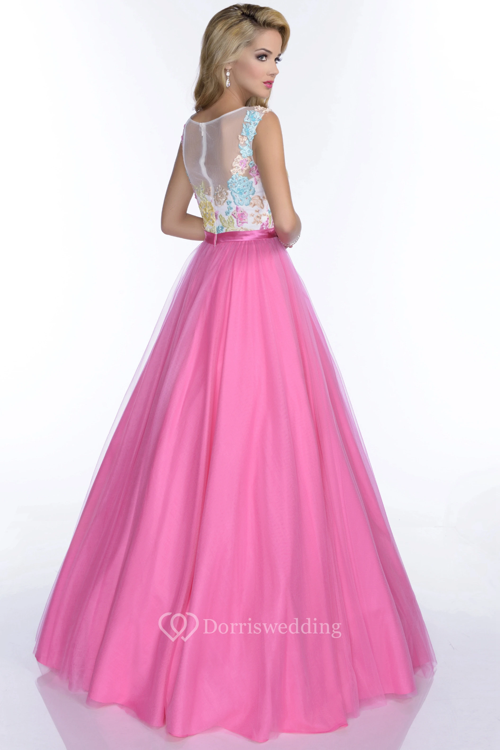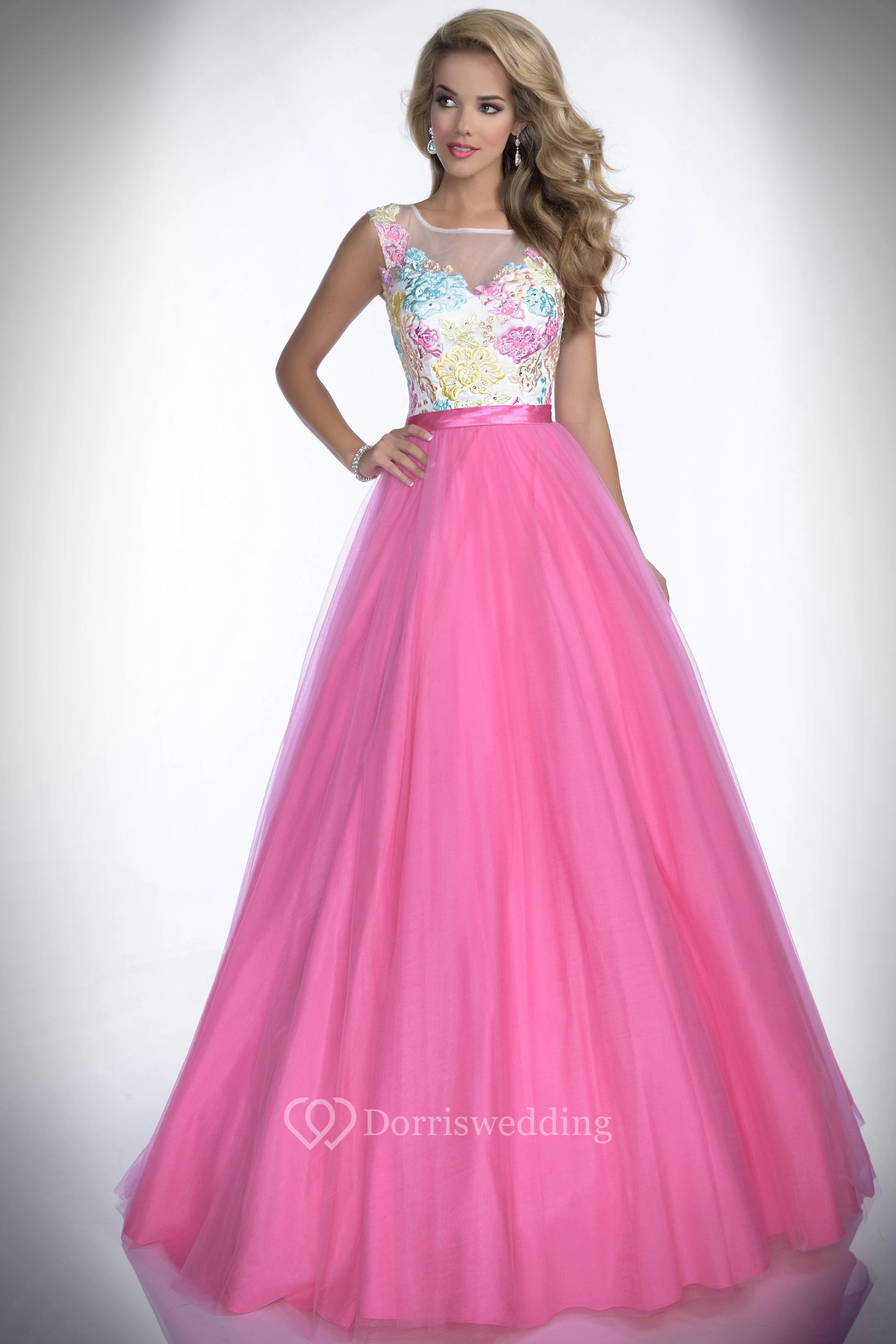 Embroidered Bodice A-Line Tulle Prom Dress With Bateau Neck