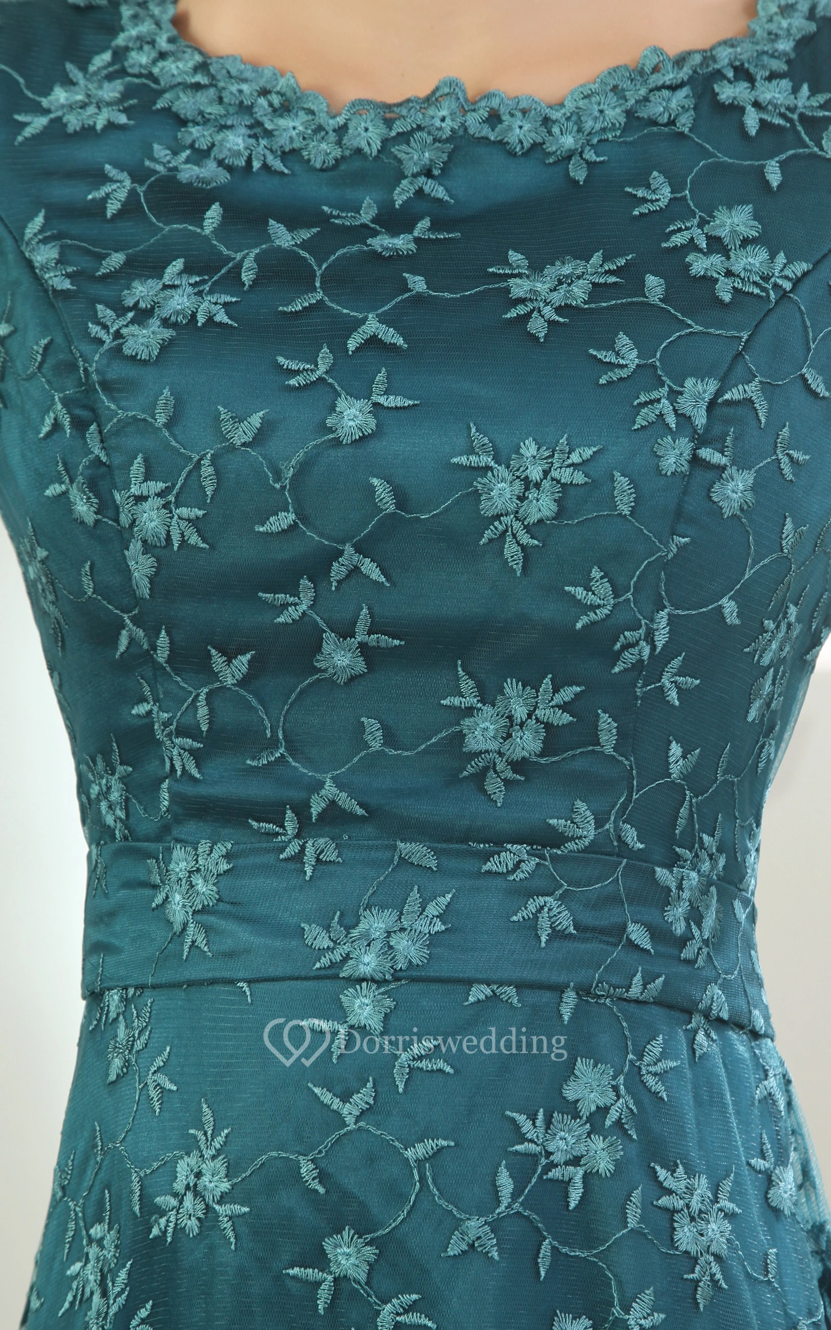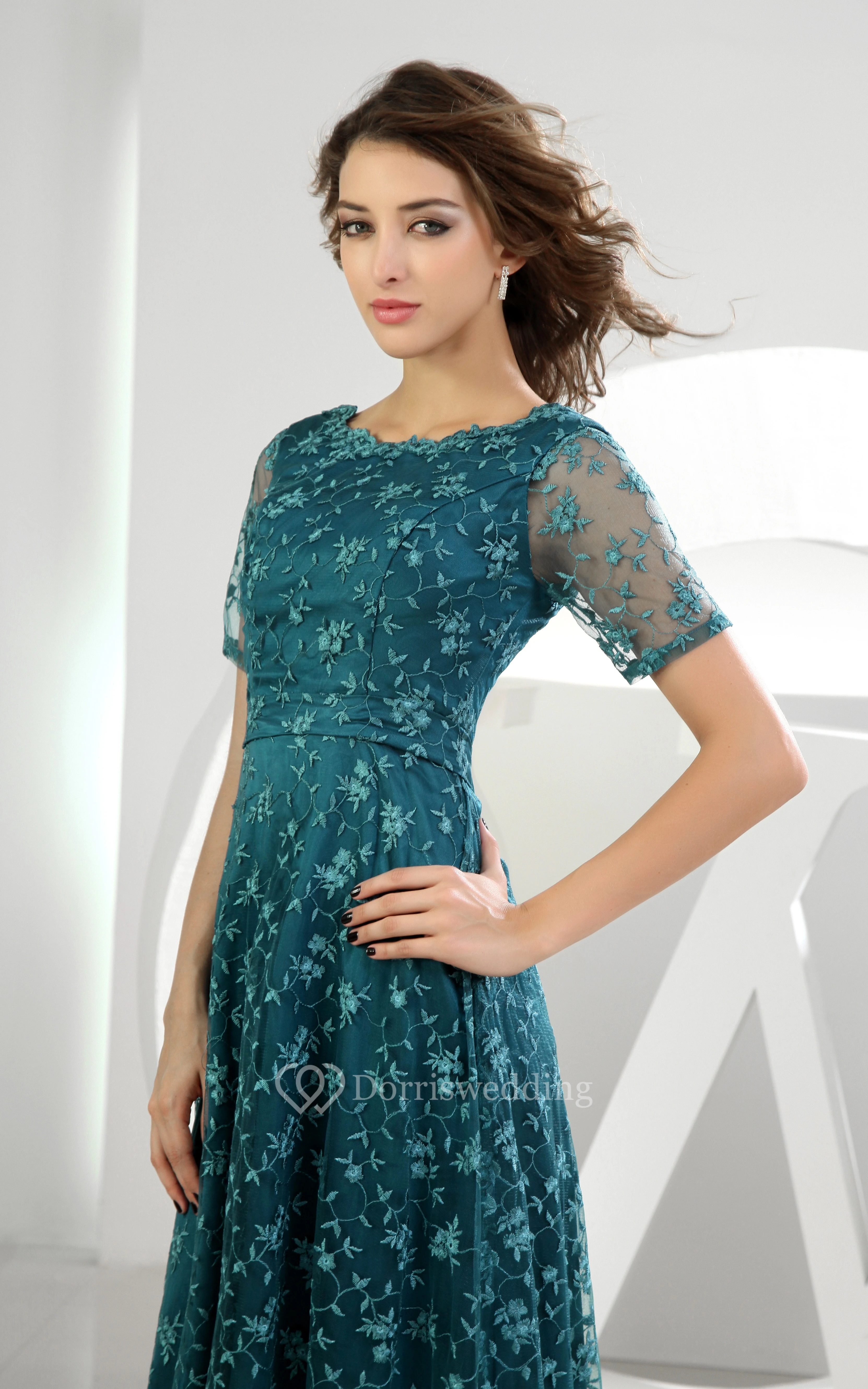 Embroidered Short-Sleeve Long Dress With Illusion Top