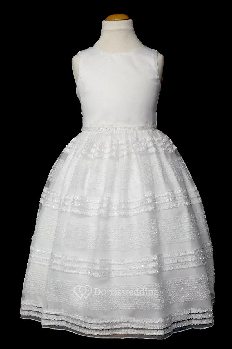 Embroideried Tea-Length Beaded Tiered Sequins&Satin Flower Girl Dress With Sash