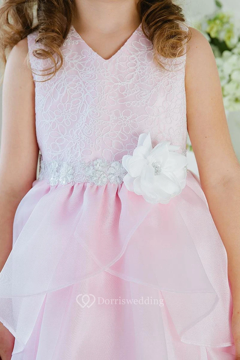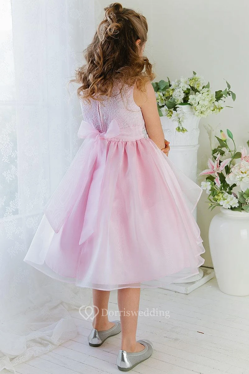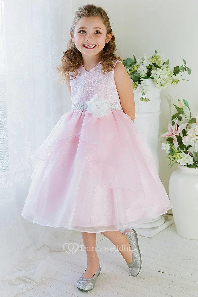 Embroideried Tea-Length Tiered Lace&Organza Flower Girl Dress