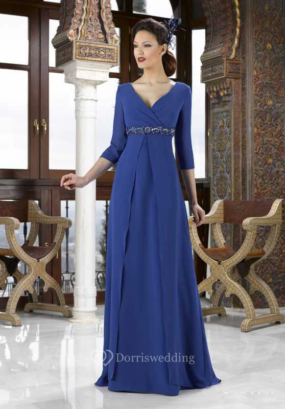 Empire 3-4 Sleeve Jeweled V-Neck Chiffon Mother Of The Bride Dress