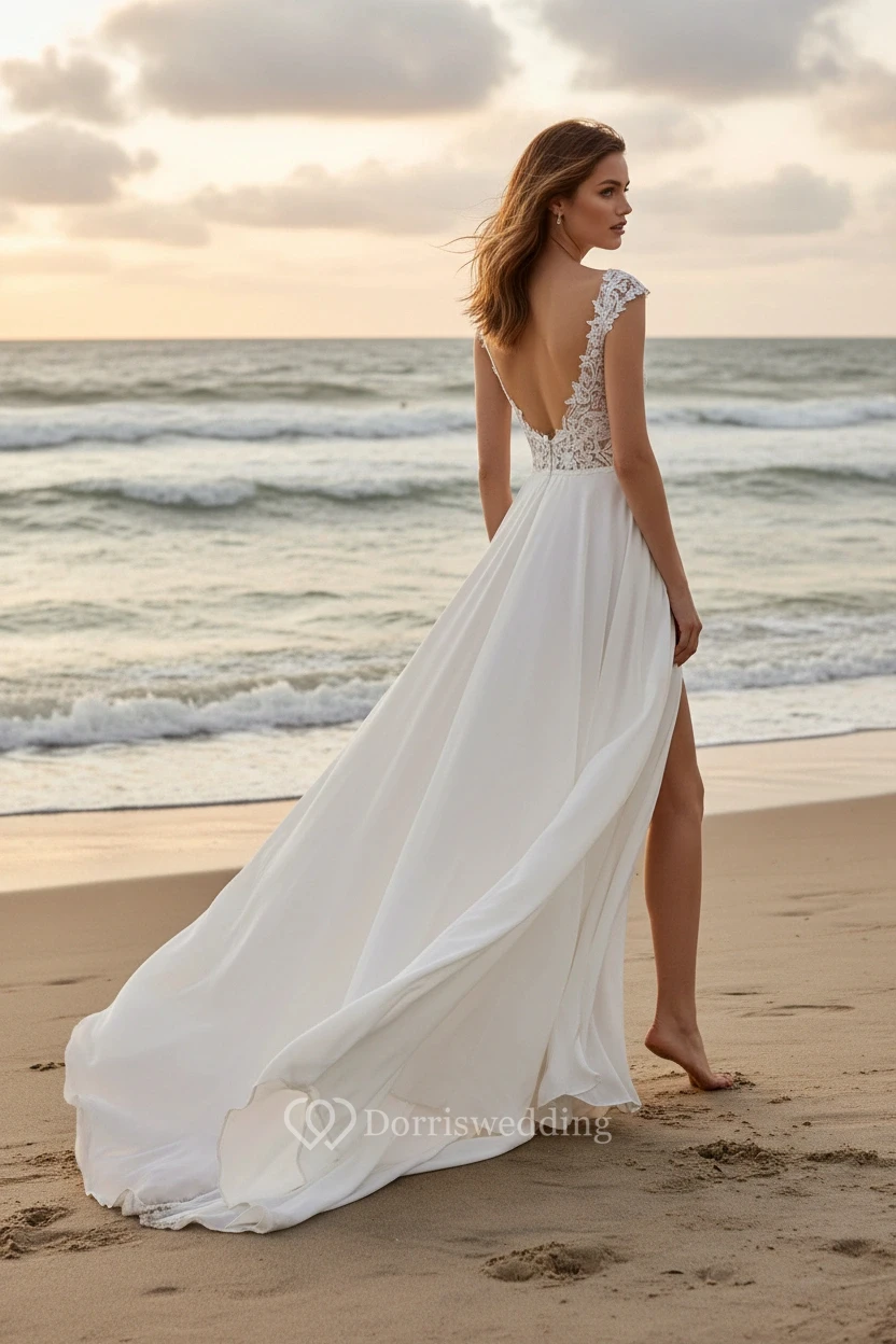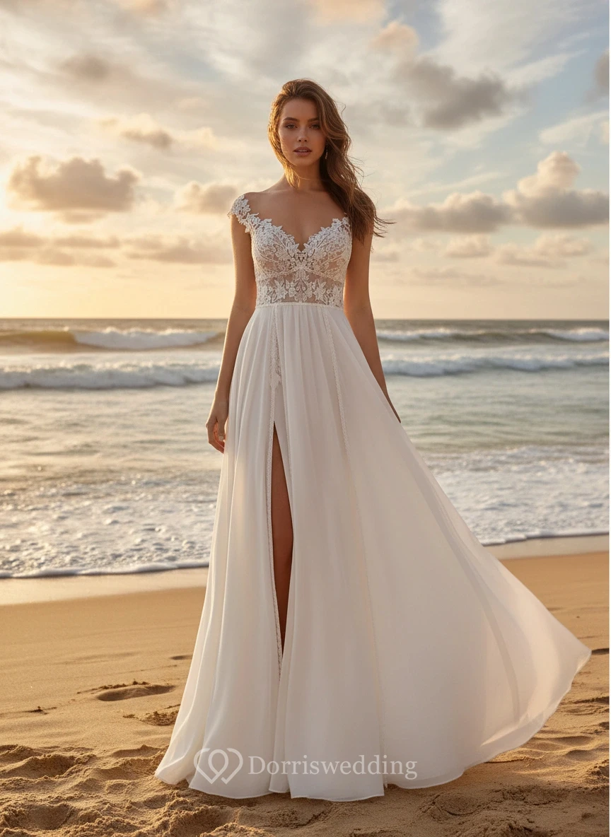 This romantic wedding dress combines lace embroidery on the bodice with a sheer chiffon skirt featuring a high slit. Perfect for beach or evening events, it provides a sleek and sensual look, flowing effortlessly in the wind.