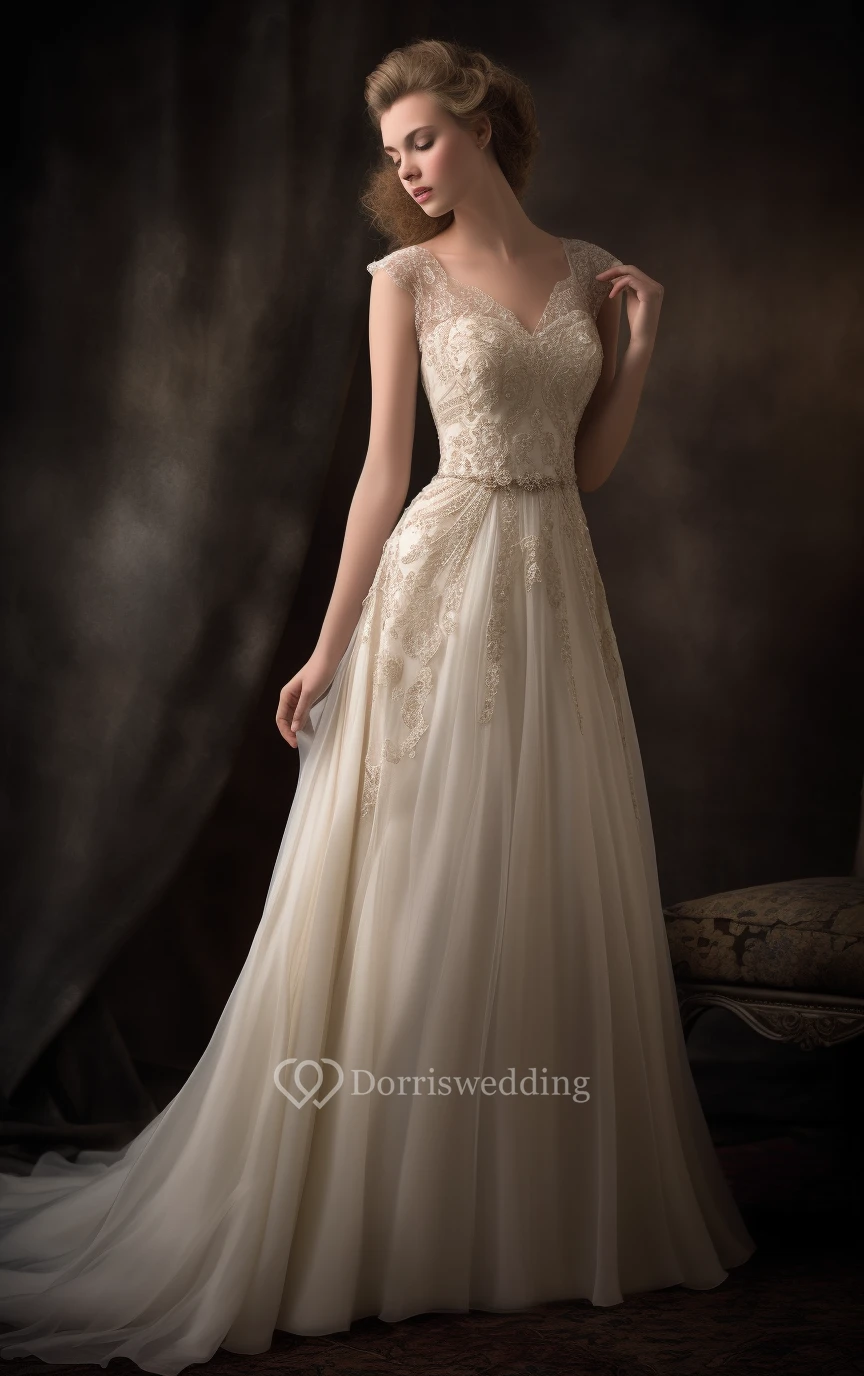 The color shown is ivory with light champagne appliques. To achieve this exact shade, select "As Shown" when placing your order.