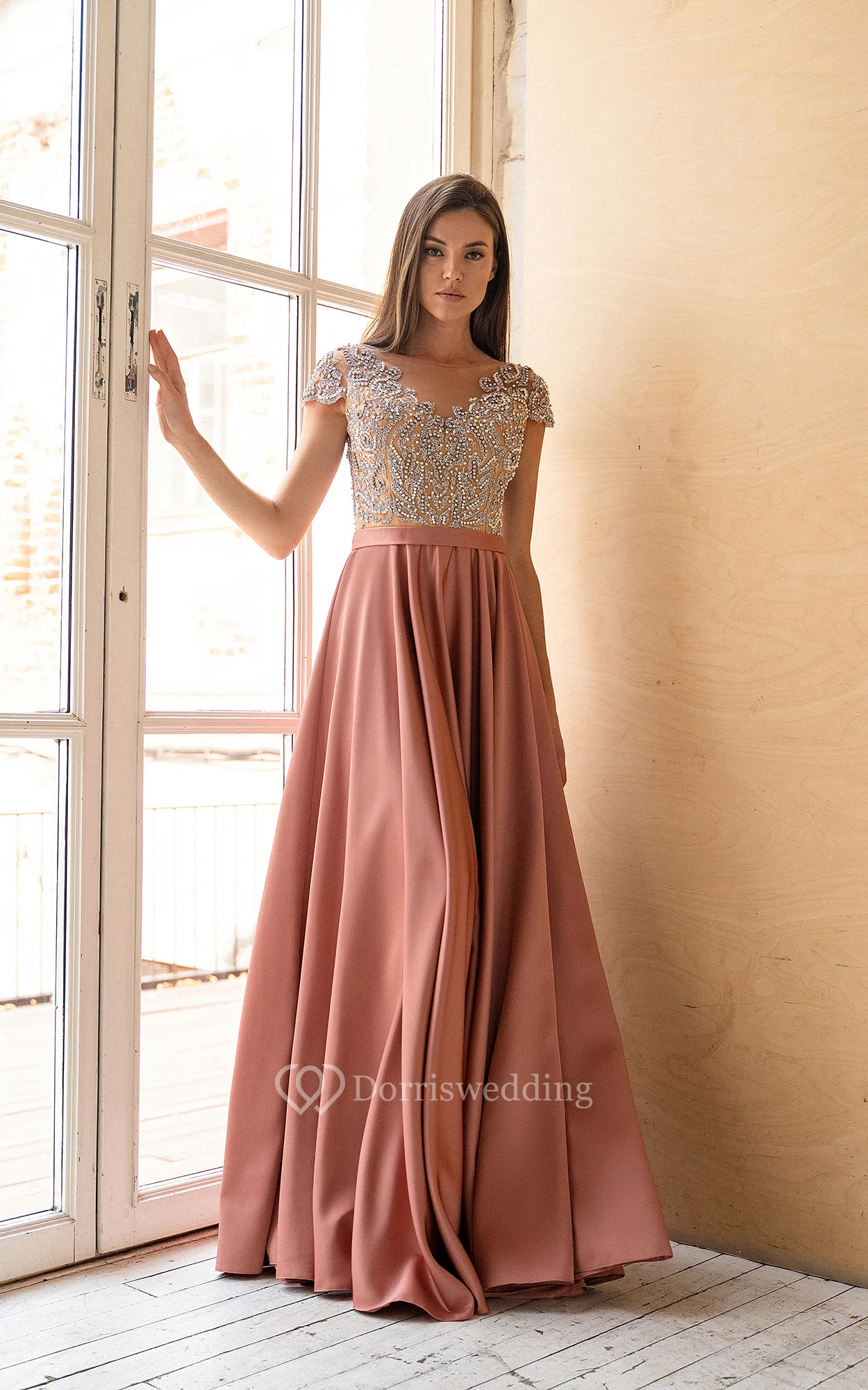 Empire Cap-Sleeve Bateau Sweep Train Satin Bridesmaid dress with Beading and Pleats