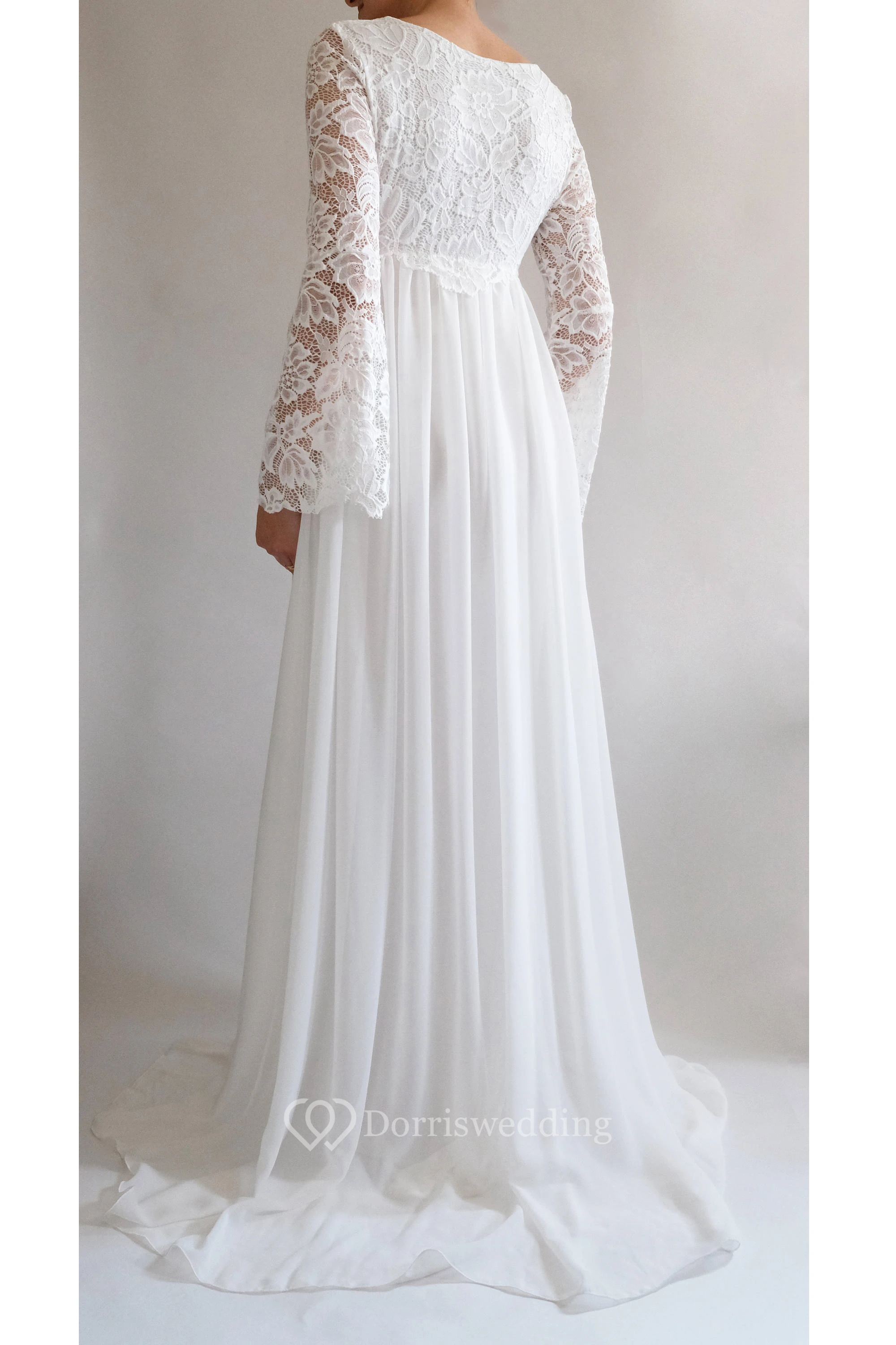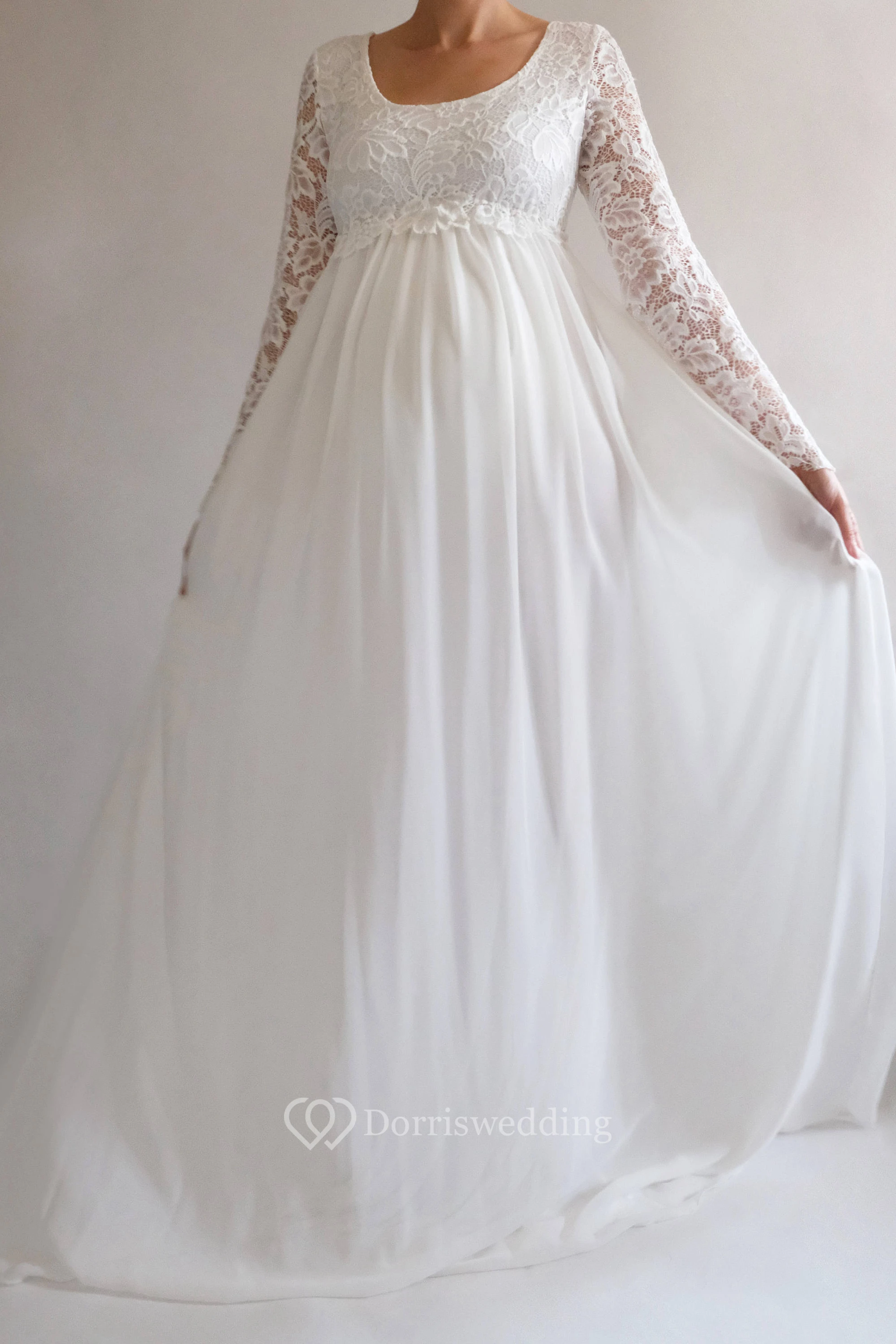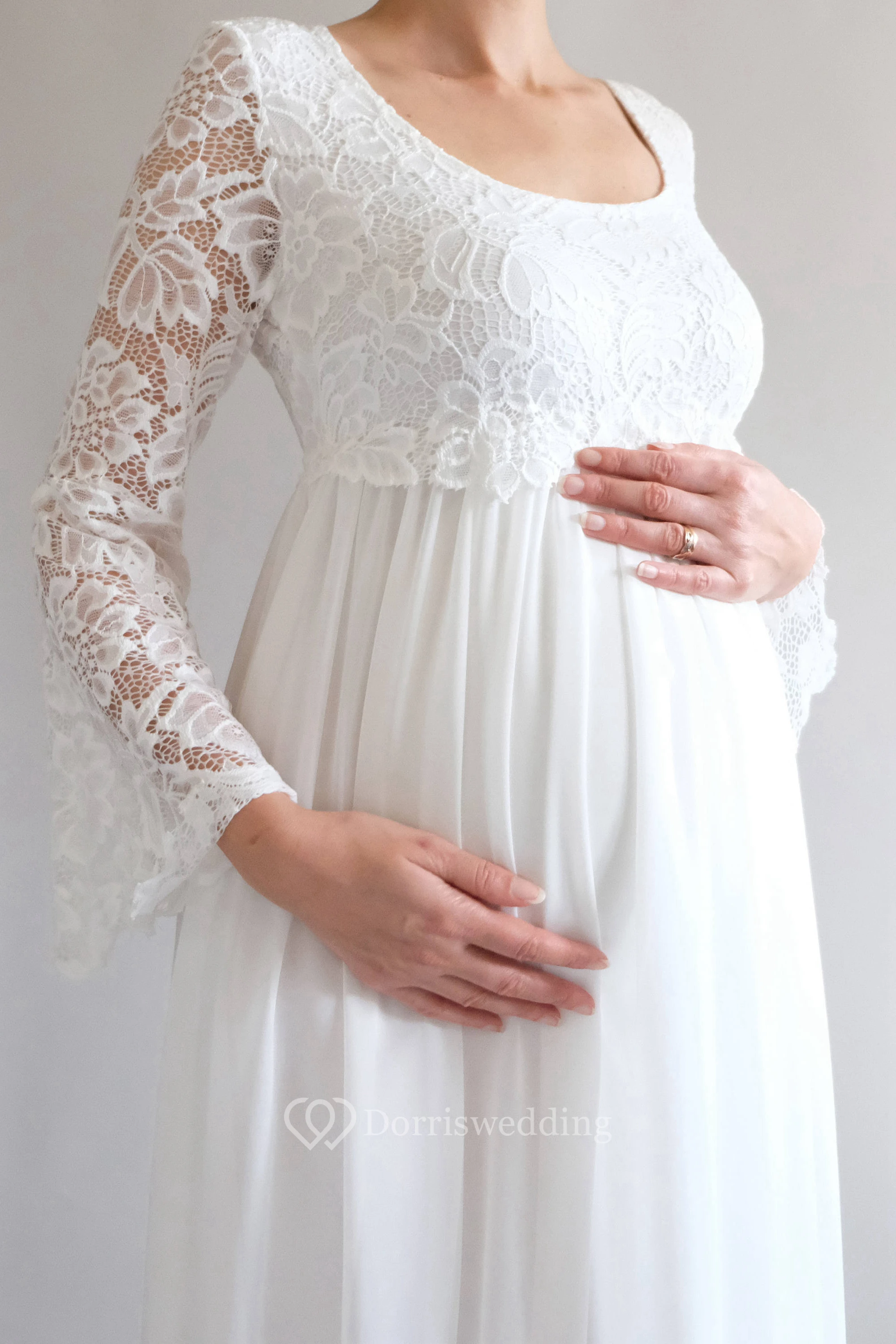 Oh. My gosh. This gown designed for the pregnant is everything I've dreamed of. It fits me so well, the chiffon is so flowy and the lace sleeves are so beautiful. I can't wait to wear it on my wedding day! It will also be an exceptional maternity photo outfit. Worth the price I spent on it. Love it!