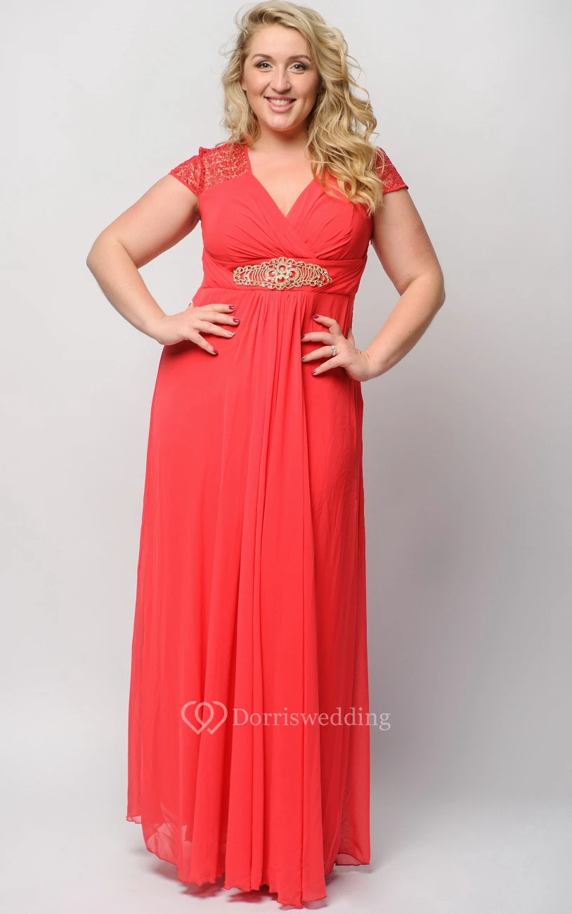 Empire Floor-Length V-Neck Short Sleeve Empire Chiffon Crystal Detailing Dress