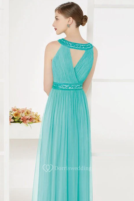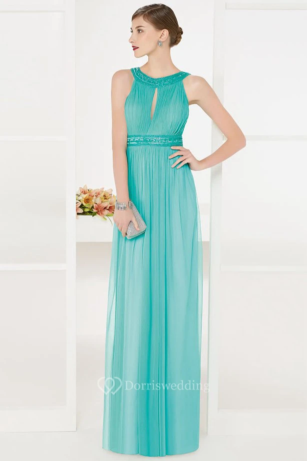 Empire Front Keyhole Tulle Long Prom Dress With Sequined Neck And Waist
