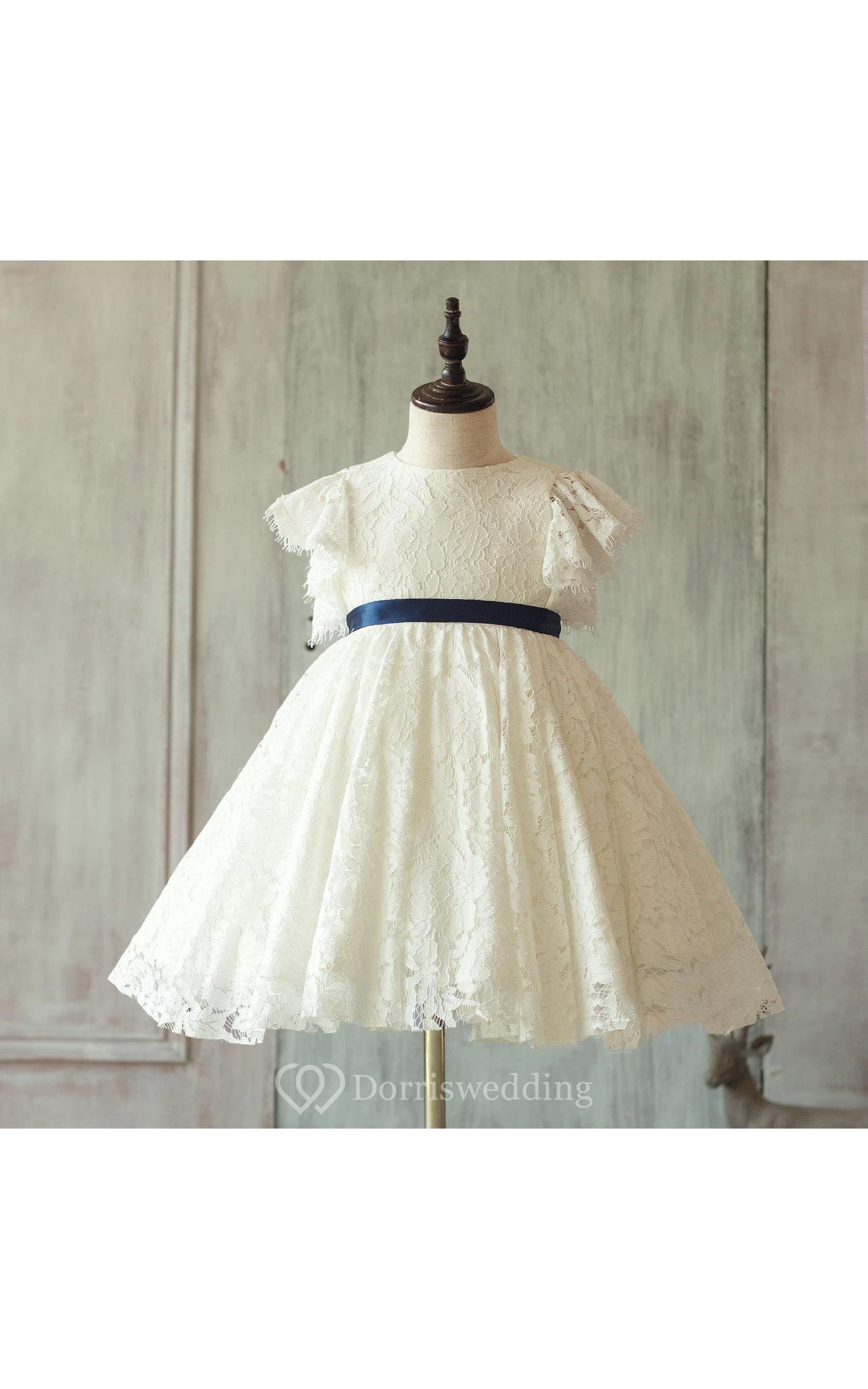 Empire High Neck Ruffle Sleeve A-line Lace Dress With Pleats and Sash