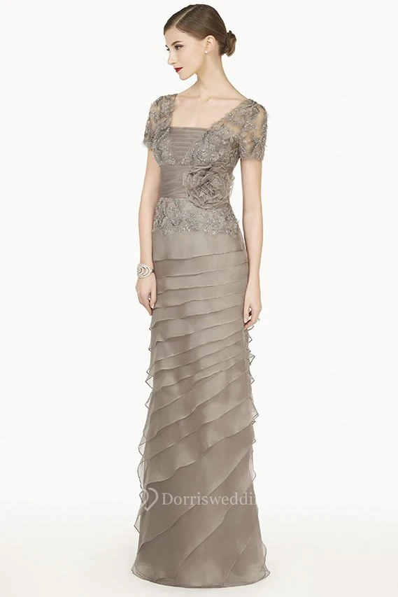 Empire Layered Long Dress With Lace Short-sleeve Jacket And Flower Sash