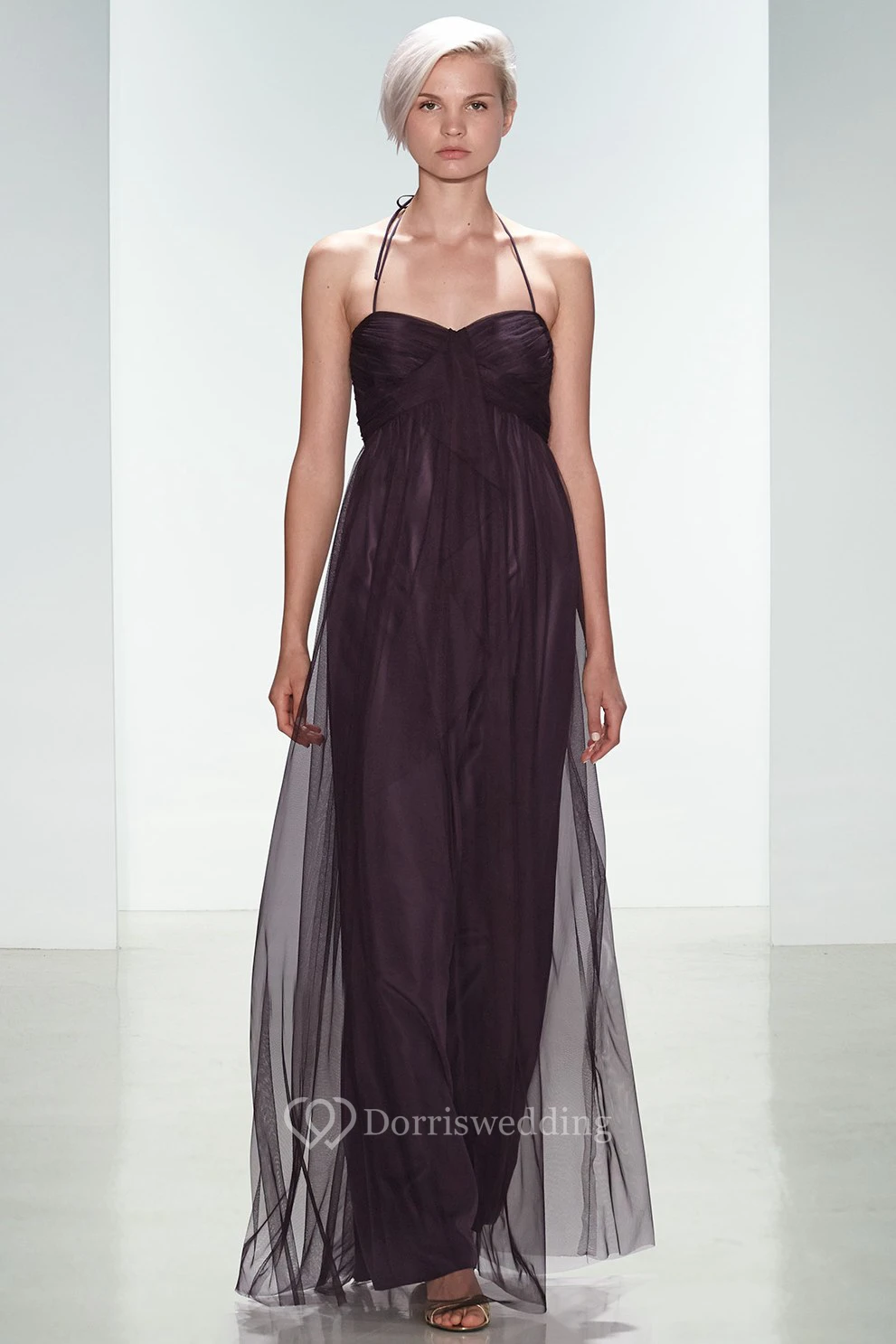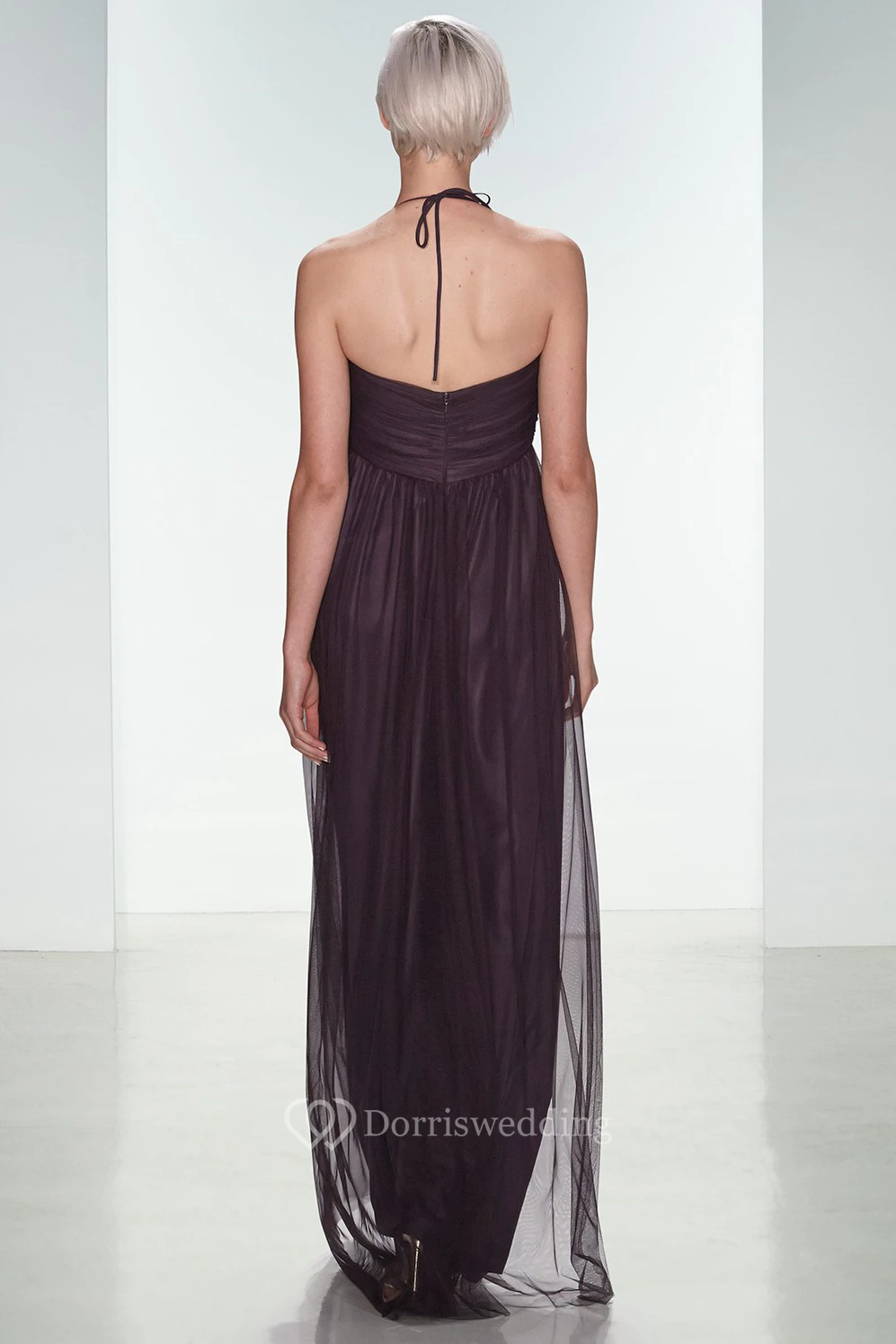 Empire Spaghetti Long Tulle Bridesmaid Dress With Ruching And V Back