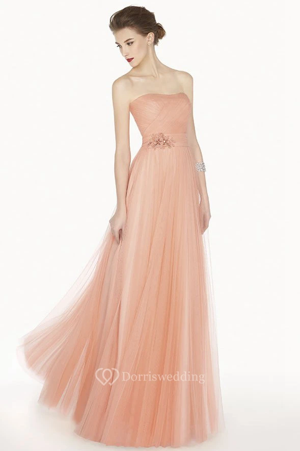 Empire Strapless A-Line Tulle Long Prom Dress With Floral Satin Sash