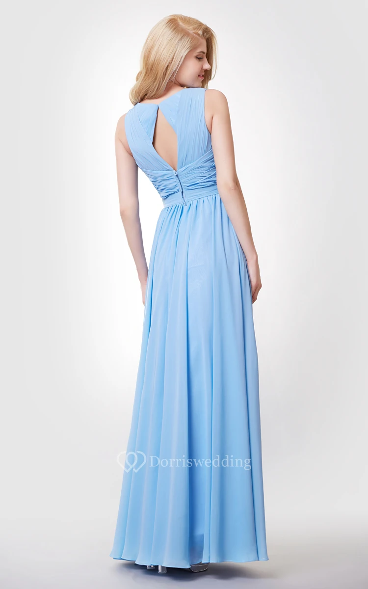 Empire V-neck A-line Pleated Chiffon Gown With Keyhole