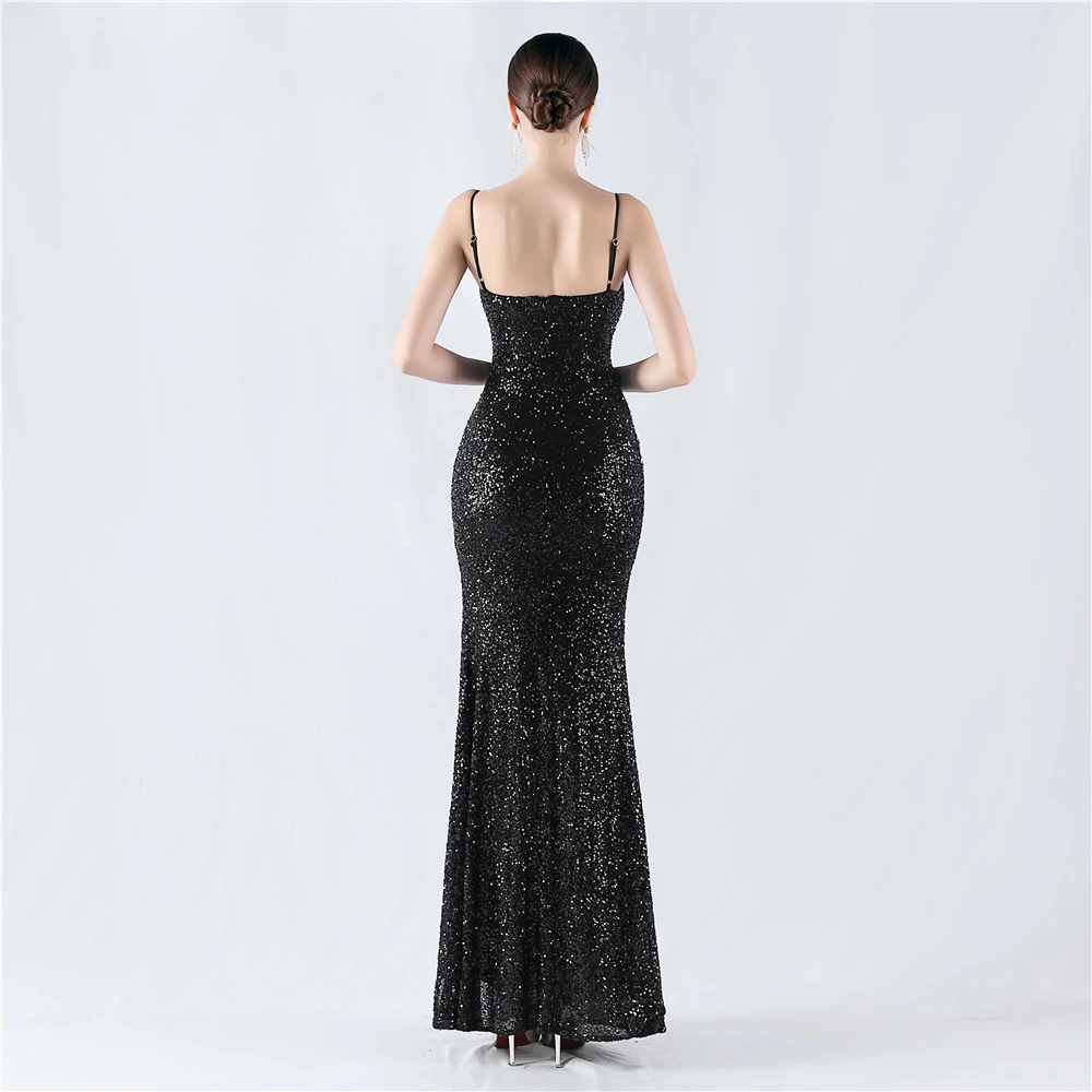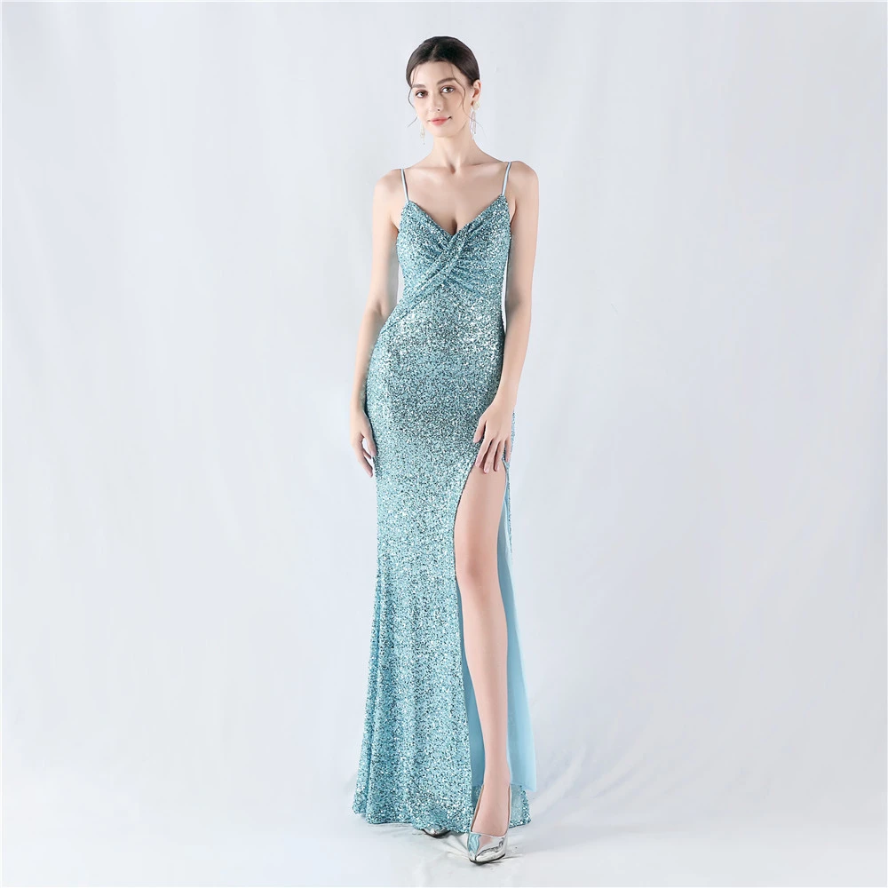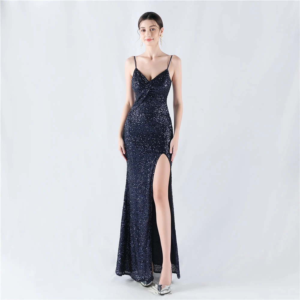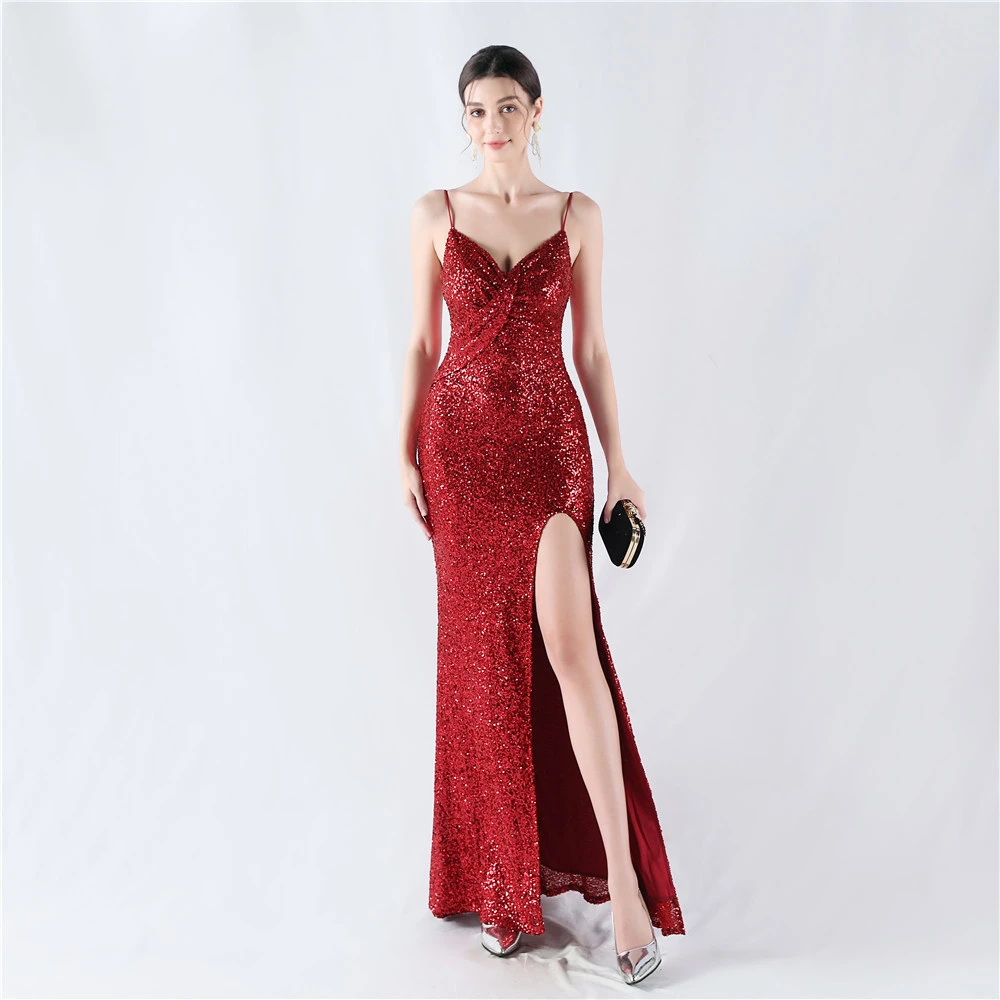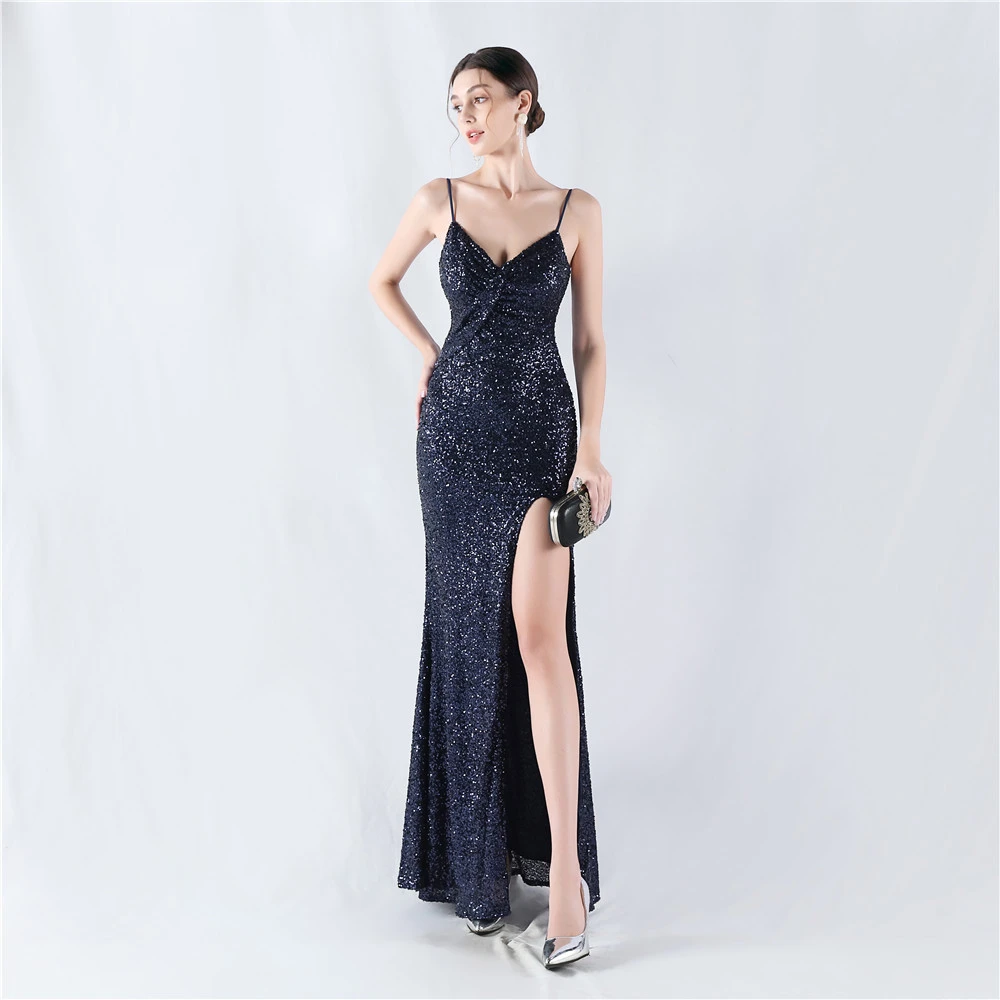 Encrypted Sequined Sexy High-Slit Suspender Evening Dress