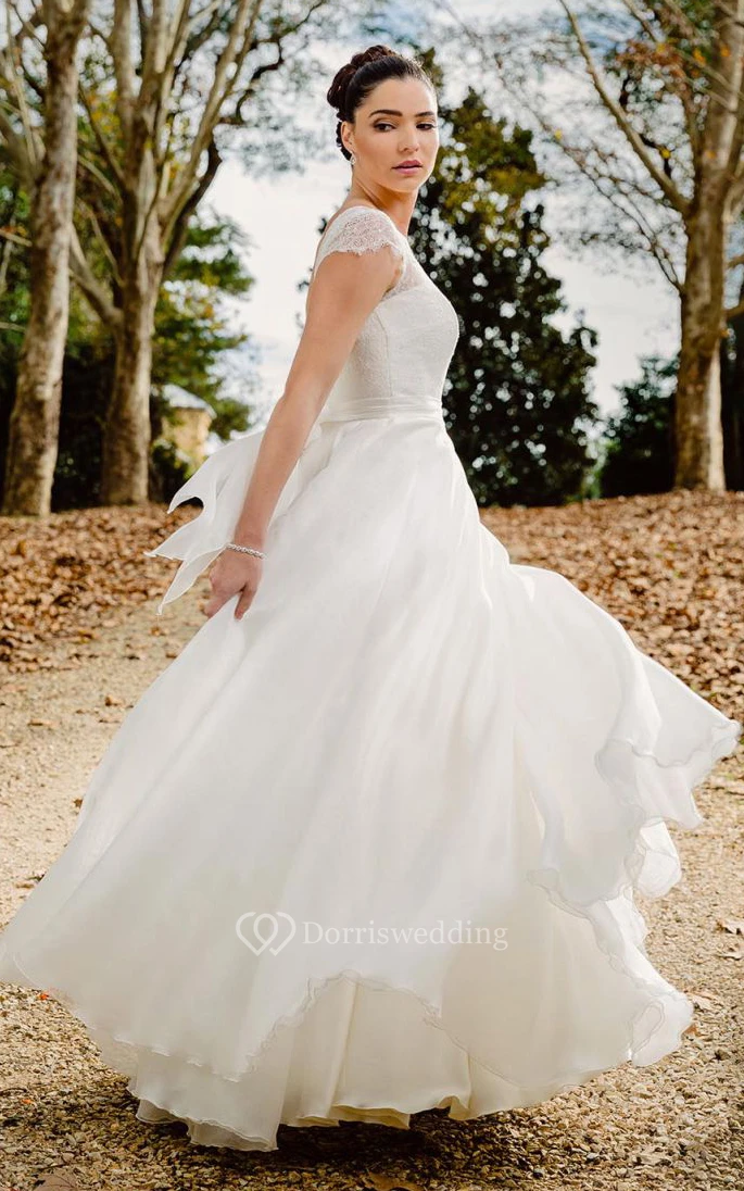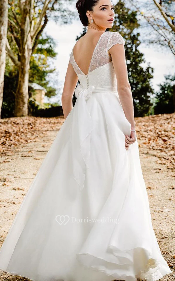Ethereal A Line Bateau Lace Chiffon Floor-length Deep-V Back Wedding Dress with Ribbon