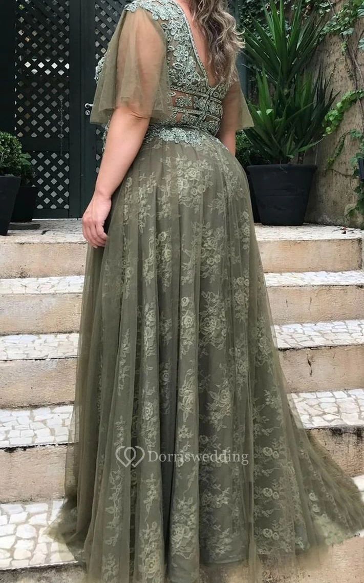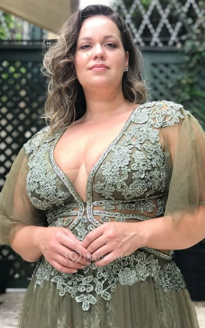Ethereal A Line Tulle Plunging Neckline Floor-length Open Back Prom Dress with Appliques