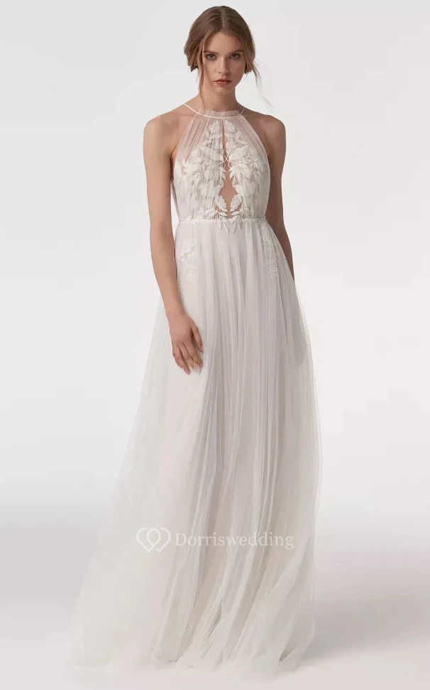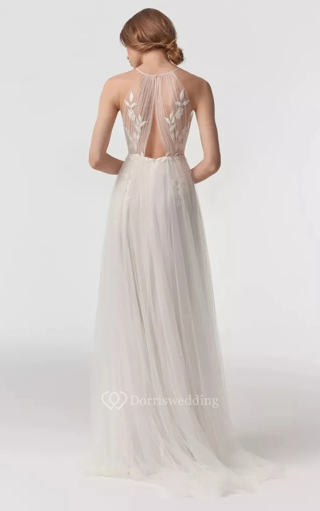 Ethereal High-neck Sleeveless Pleated Empire Tulle Beach Wedding Dress with Applique