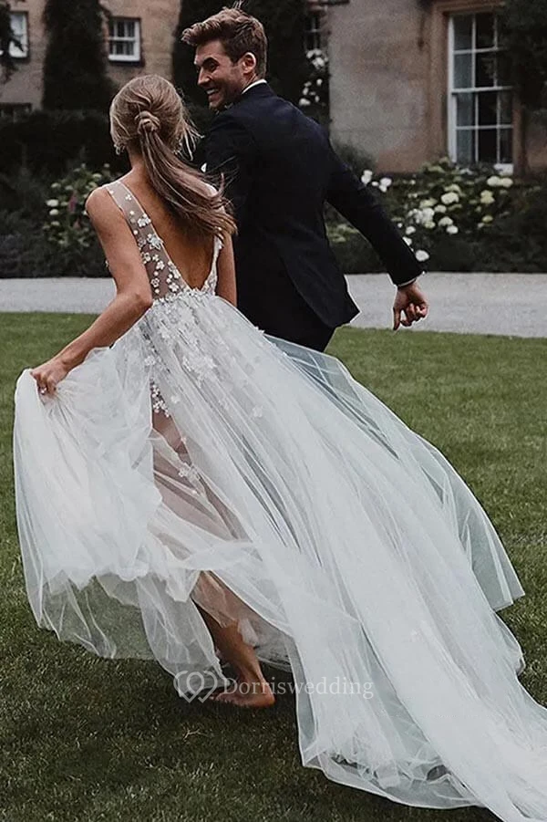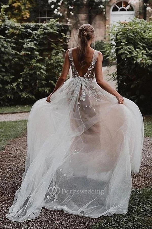 Ethereal Plunged Empire Sleeveless Tulle Applique Wedding Dress