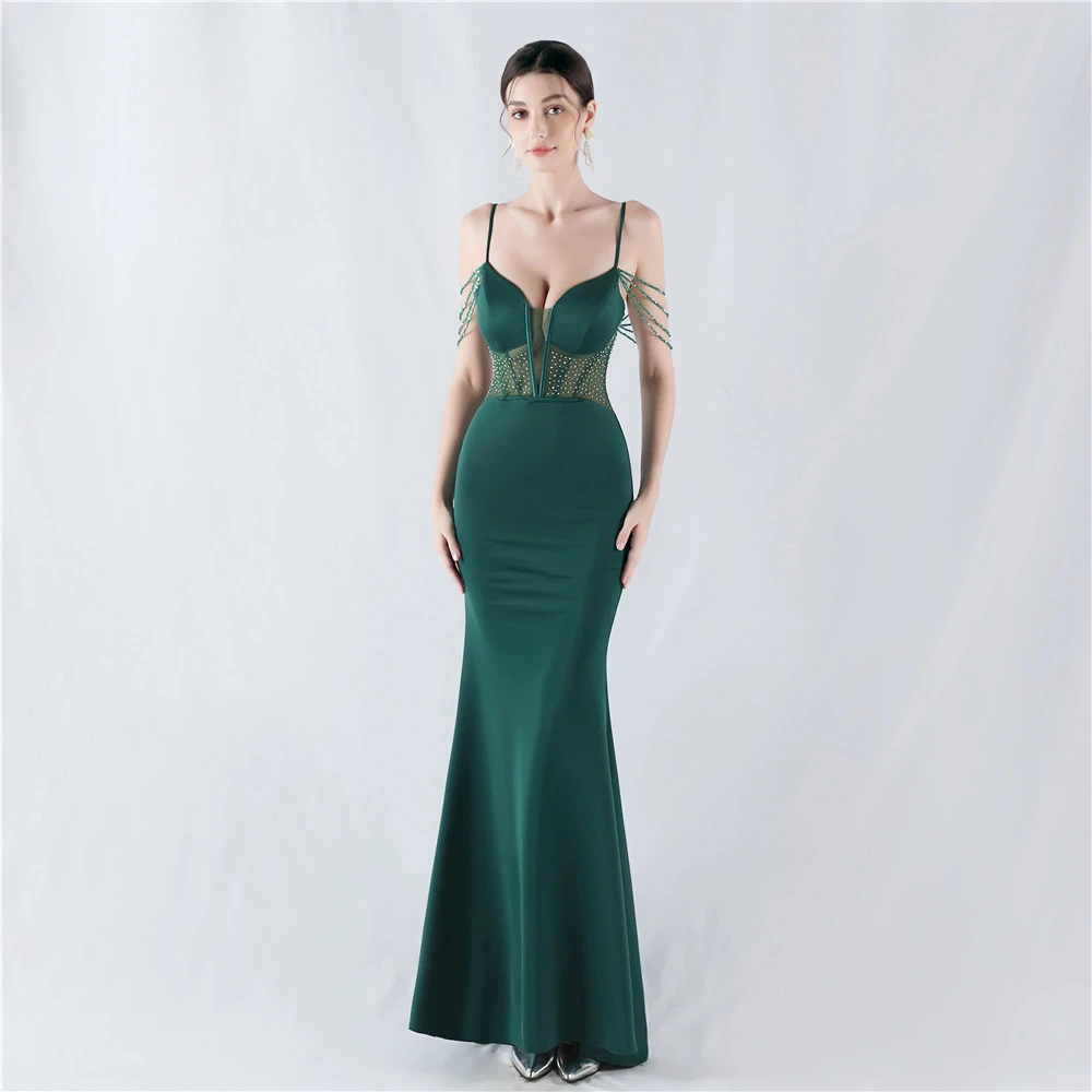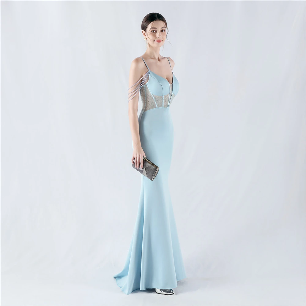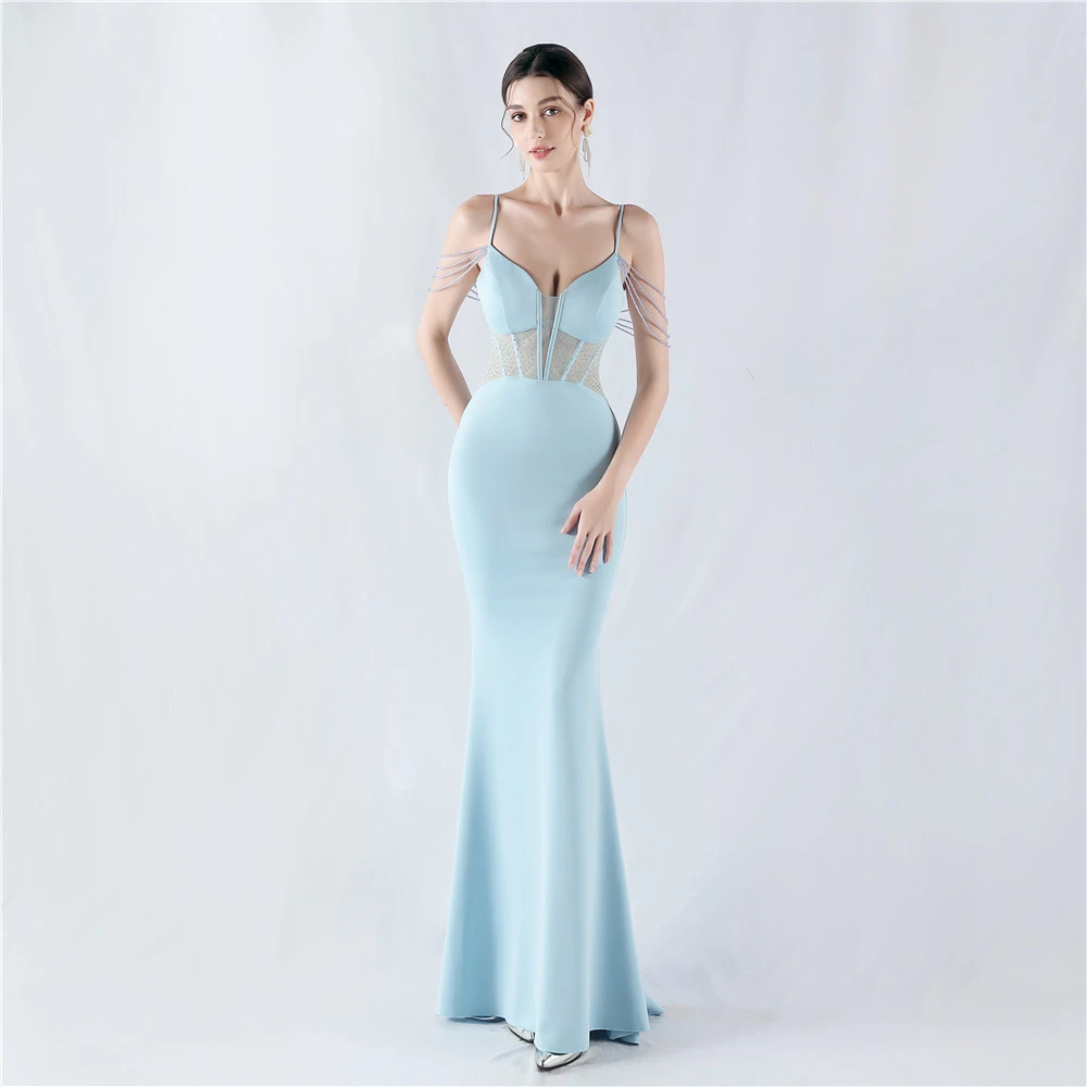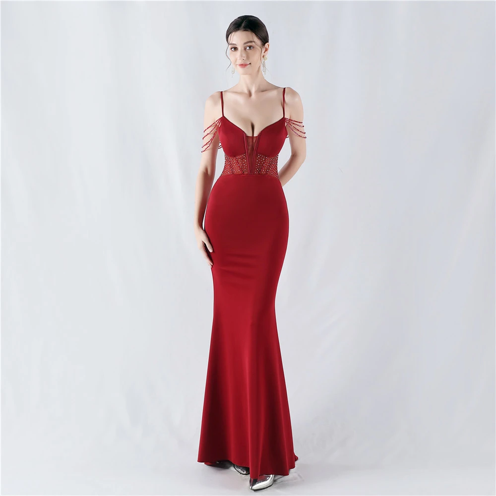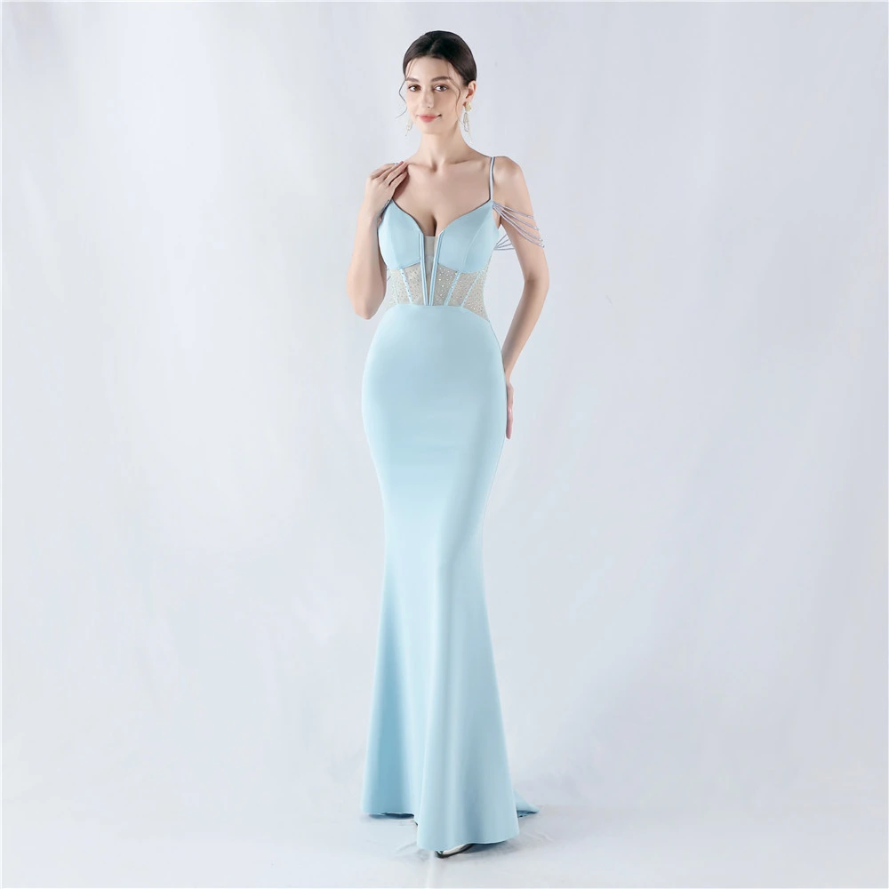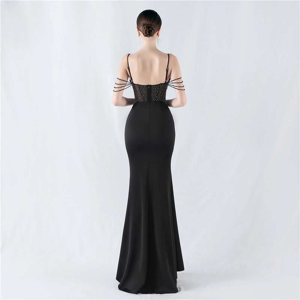 Evening Dress Waist Fishbone Beaded Hot Diamond Banquet Performance Host Evening Dress