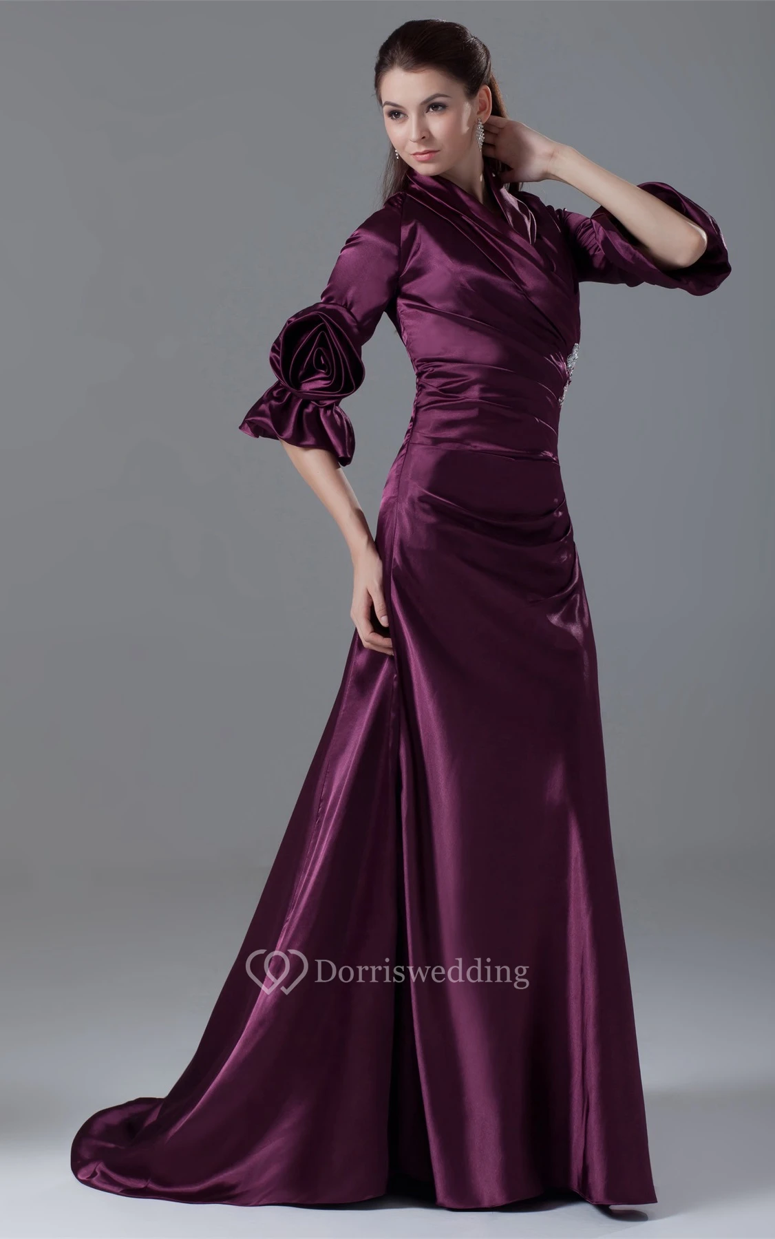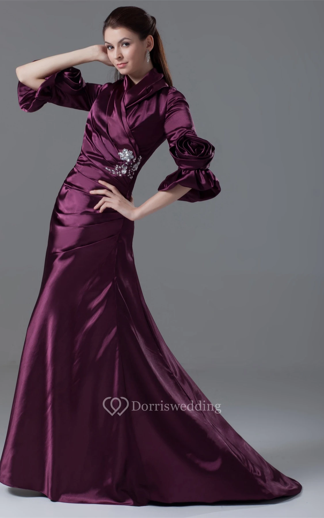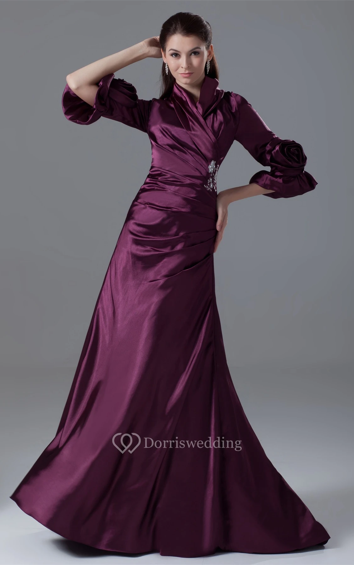 Exquisite Side-Ruched Long-Sleeve Beading and Gown With Flower