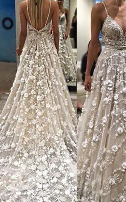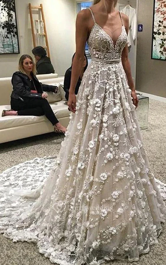 Exquisite Spaghetti Ball Gown Beaded A-line Lace Floral Beach Wedding Dress