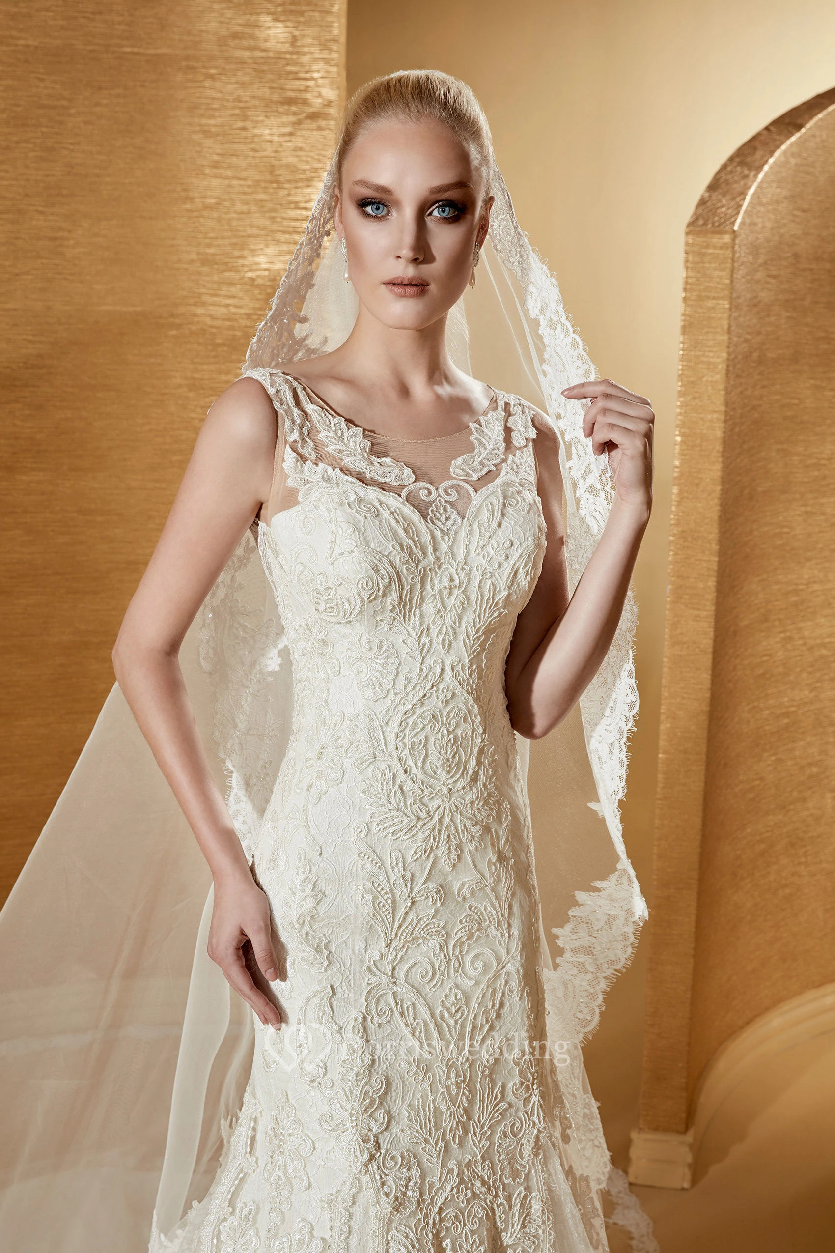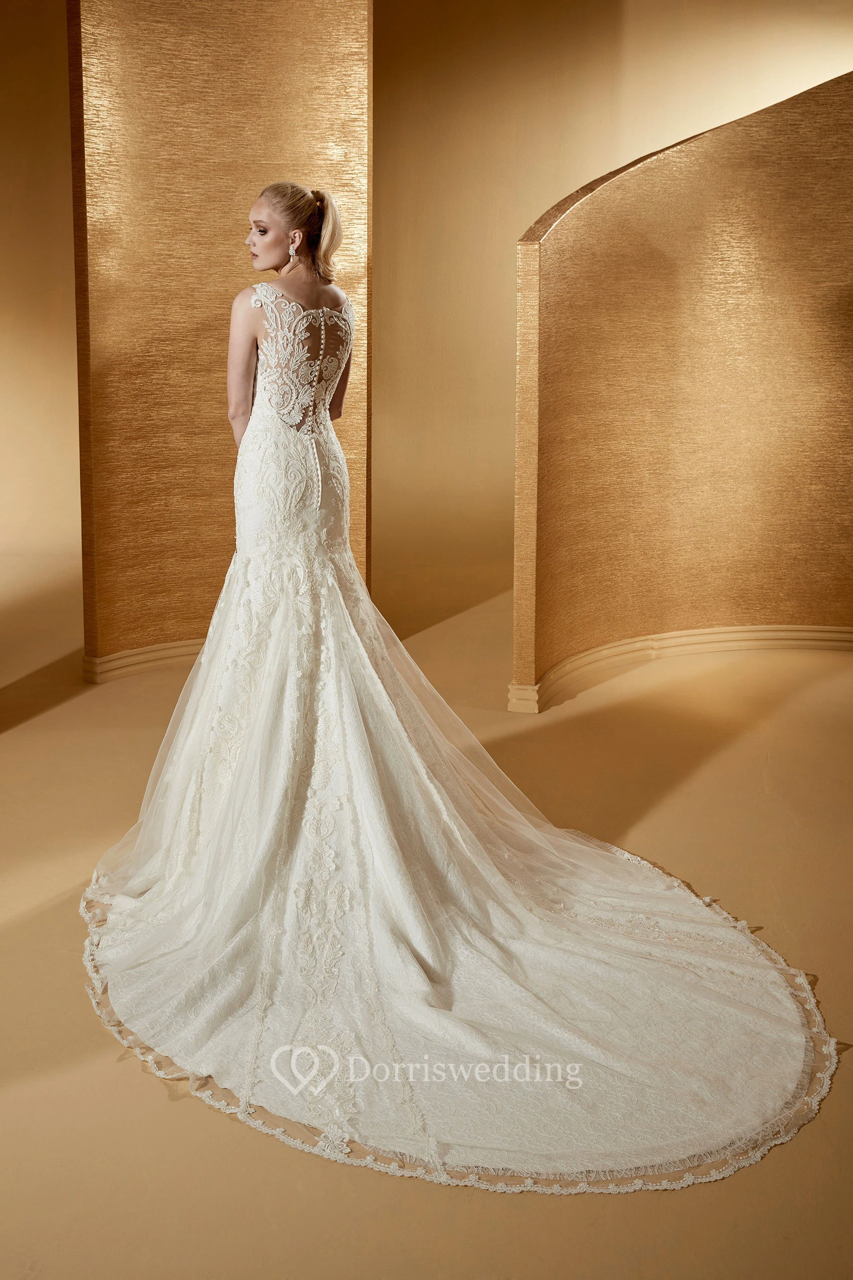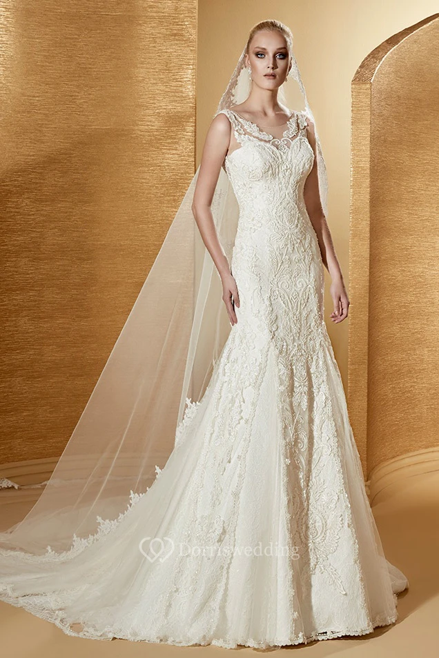 Exquisite V-Neck Mermaid Bridal Gown With Illusive Lace Straps And Court Train