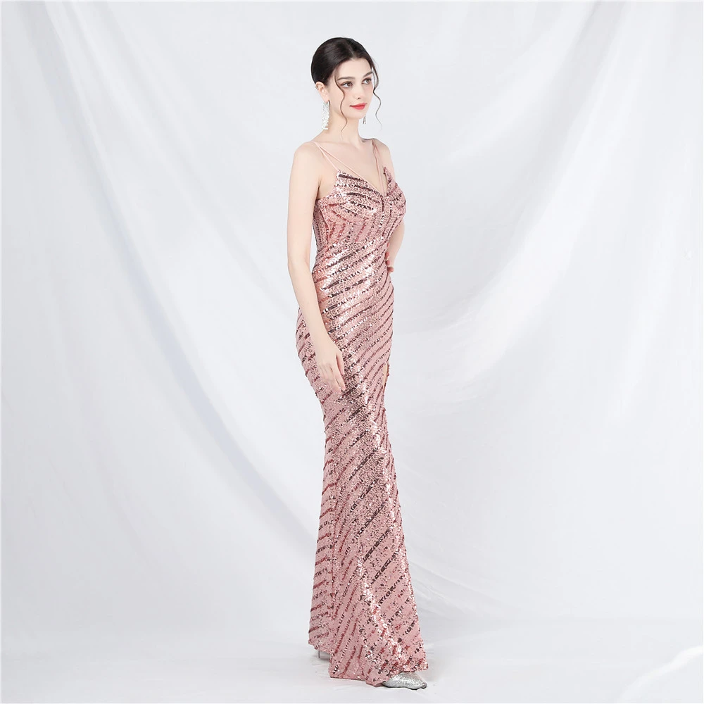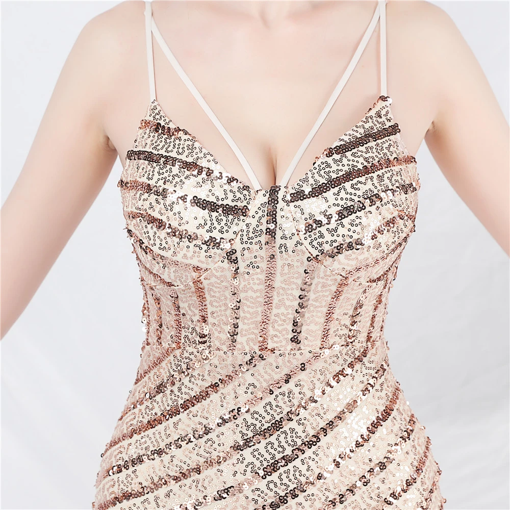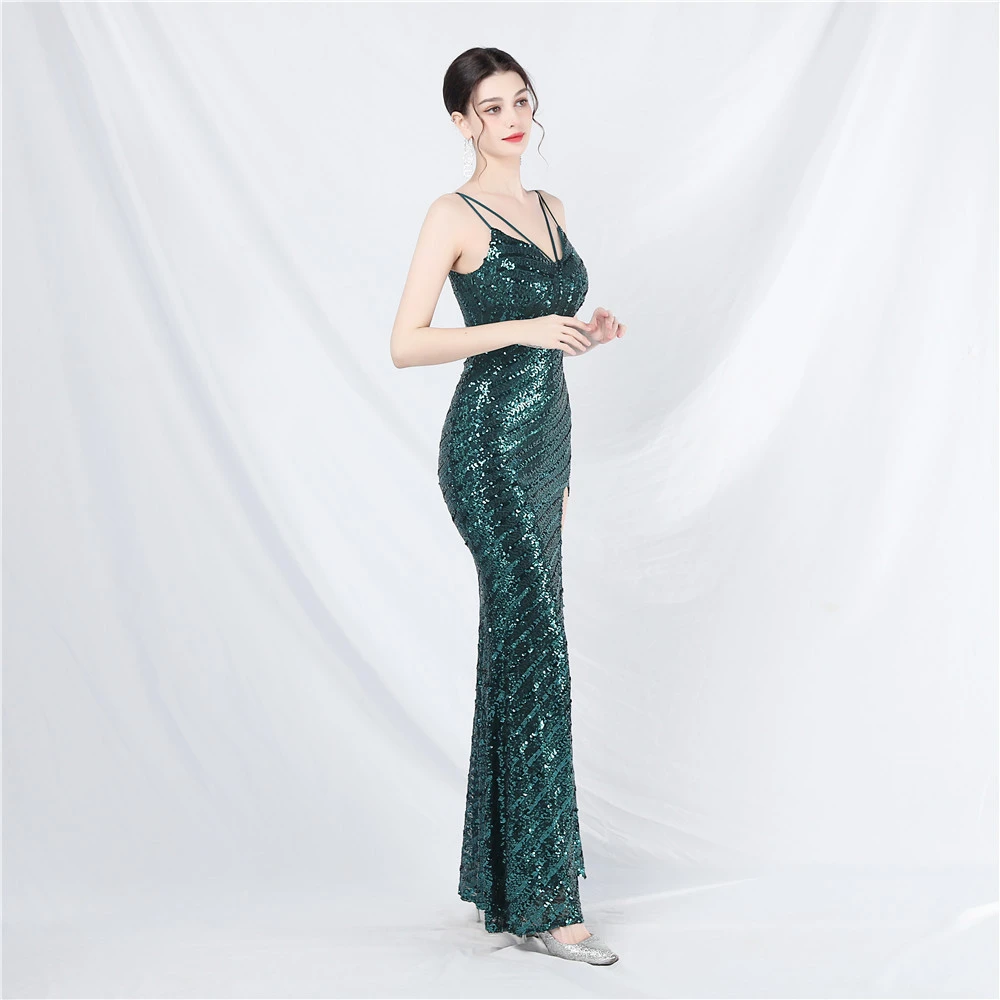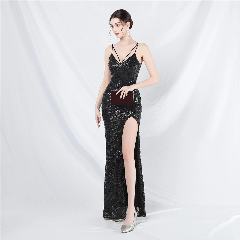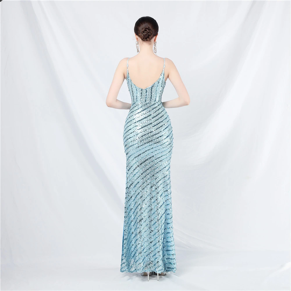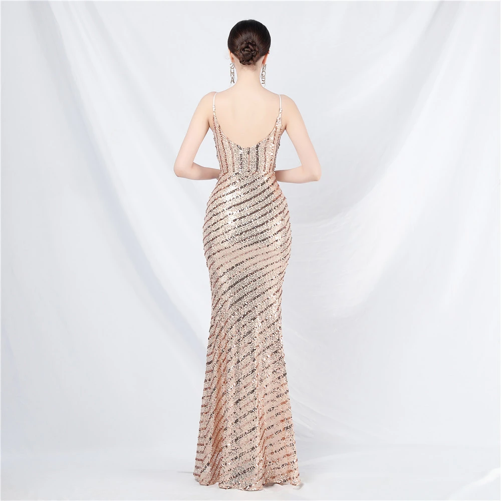 Fashionable Women'S Suspender Low-Cut Sequined Evening Dress